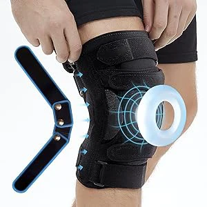 Troslojni aluminijasti zlitinski tečaji, skriti na obeh straneh opornice za koleno, zagotavljajo zadostno kompresijo in podporo za koleno in patelo.