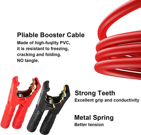 Zasnovani za močno delovanje, kabli uporabljajo zgoščeno 30 mm² presečno površino in prevodnike na osnovi bakra. Notranje jedro zagotavlja trdno prevodnost, ki jo izboljšuje konstrukcija iz aluminija s prevleko iz bakra (CCA) za trajnost. Klampi, izolirani s PVC-jem, so barvno kodirani rdeče (pozitivno) in črno (negativno) ter zasnovani tako, da ostanejo fleksibilni v hladnem vremenu, hkrati pa odporni na obrabo za dolgo življenjsko dobo. Kablji ostajajo prožni in zanesljivi tudi v ekstremnih pogojih, vključno s temperaturami do -40°C.