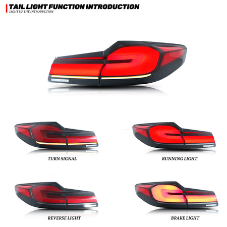 BMW G30 F90 M5 LED Facelift Zadnje Luči – Sekvenčni Signal — Moderne LED facelift zadnje luči, zasnovane za nadgradnjo vašega BMW G30/F90 M5 z jasnimi, privlačnimi sekvenčnimi smerniki in visoko vidno rdečo osvetlitvijo za izboljšano varnost in slog.