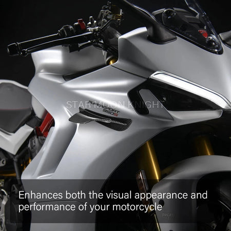 Izboljšajte svojo Ducati Panigale s temi aerodinamičnimi deflektorji stranskih kril, izdelanimi iz visokokakovostne ABS plastike za izboljšanje zmogljivosti in sloga. Vbrizgano oblikovana krilca imajo obliko zračnega profila, ki povečuje potisno silo pri hitrosti, kar pomaga ohranjati sprednji del na tleh in izboljšuje stabilnost med agresivnim zaviranjem in hitrim ovinkarjenjem. Z zmanjšanjem dviga sprednjega dela minimizirajo nagnjenost k vožnji na zadnjem kolesu in zagotavljajo bolj samozavestno izkušnjo vožnje na ovinkastih cestah in dirkalnih dneh. Oblika krilca prav tako ohranja kompakten sprednji profil, medtem ko ohranja nizko koeficienta upora (CX), tako da pridobite boljšo stabilnost brez nepotrebnega aerodinamičnega upora. Izdelana s preciznostjo in končana, da se lepo prilega motociklu, ta krilca povečujejo tako športnost kot vizualni učinek.