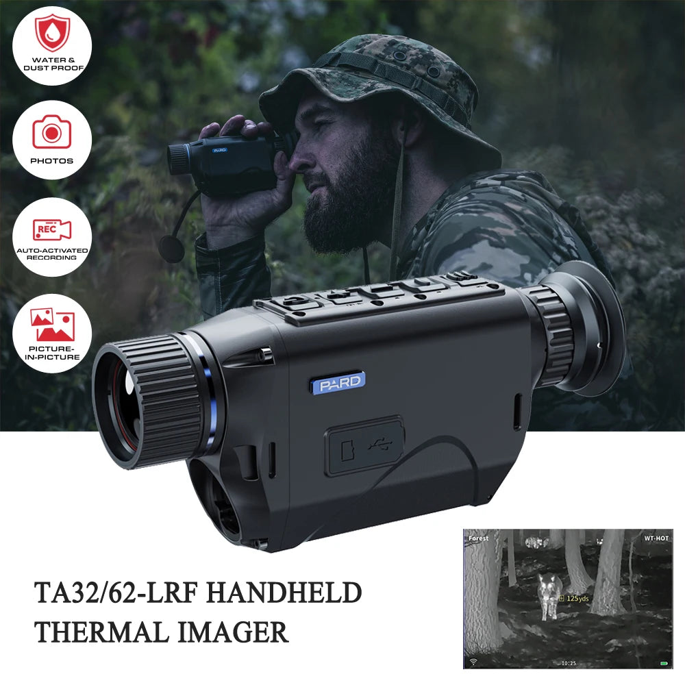 PARD TA32-LRF/TA62-LRF – 1000m daljnogled, 25mK NETD: Kompaktni termalni daljnogled z vgrajenim laserskim daljinomerom, zasnovan za dolgoročno zaznavanje, jasen OLED zaslon in robustno zaščito IP67 za zanesljivo uporabo na prostem.