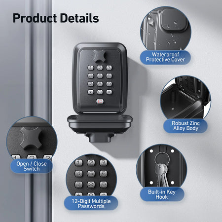 Varen, priročen in zasnovan za dolgotrajno uporabo, je Jugacool Waterproof 12 Digit Key Safe For Wall Mount Security Box pametna rešitev za organizacijo in zaščito ključev, dostopnih kartic ali manjših nujnosti. Z možnostmi 12-mestne gesla lahko nastavite tisoče kombinacij za izboljšano varnost in delite dostop s zaupanja vrednimi osebami, ne da bi razkrili svoje kode.