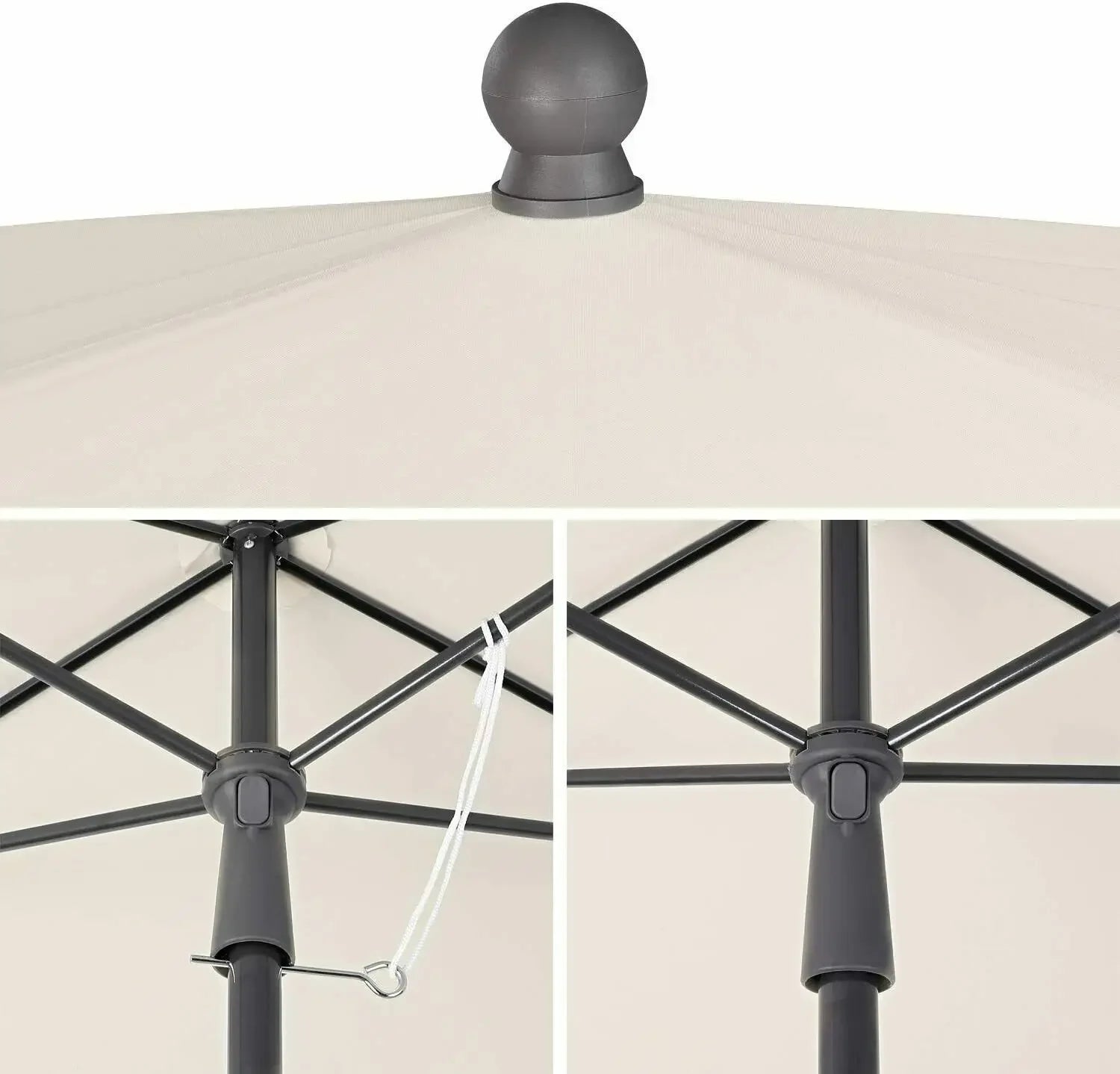 Zgrajen za trajnost, ima cinkovo zlitinsko palico in trden jeklen okvir s štirimi rebri. Gladka ročica odpre in zapre senčnik, medtem ko vam rotacijska ključavnica omogoča enostavno prilagajanje višine za udobno sedenje in obroke. Senčnik je izdelan iz 100% poliestra s zaščitnim premazom (približno 180 g/m2), kar zagotavlja močno UV zaščito in obstojno barvno zmogljivost tudi pri izpostavljenosti soncu.