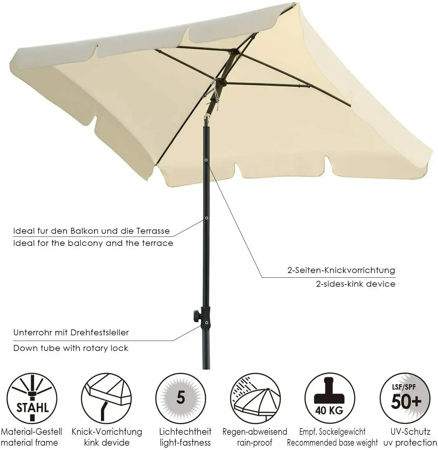 Uživajte v hladni, zanesljivi senci z pravokotnim senčnikom Rectangular Parasol Canopy Sun Umbrella, velikosti 200 x 125 cm. Zasnovan za zunanje prostore, ta senčnik nudi zaščito pred soncem UPF 50+ in vodoodporno pokritost, tako da boste vi in vaša družina ostali udobni na vročih sončnih dneh ali ob lahkem dežju na terasi, balkonu ali patioju.