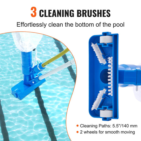 Prednosti: Ta komplet za sesanje bazena poenostavi rutinsko vzdrževanje bazena—njegova prilagodljiva teleskopska palica in kompaktna glava dosežeta tesne prostore in plitva območja, medtem ko pralna mrežna torba ujame liste in usedline. Idealno za hitro čiščenje, zmanjšuje ročno zajemanje in pomaga ohranjati bolj jasno vodo z manj truda.