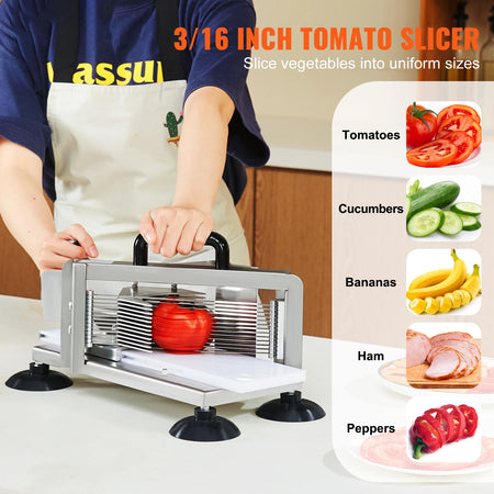 Tehta 3,3 kg (7,3 lbs), ta ročni rezalnik za paradižnik zagotavlja stabilnost v različnih nastavitvah - od domačih kuhinj do hotelskih kuhinj, restavracij in burger jointov. Nadgrajena zasnova podpira različne sestavine, vključno s paradižniki, kumarami, bananami, šunko, papriko in še več, kar ga naredi vsestransko orodje za vsakodnevno pripravo hrane.