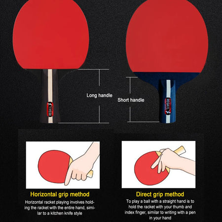 Izboljšajte svojo igro s setom za namizni tenis Racket Set Pro — vsestranski, trpežni dvojni lopar, zasnovan za začetnike, treninge in priložnostne tekme. Vsak lopar ima visoko gostoto stisnjeno sedemplastno leseno rezilo za dolgotrajno delovanje in zanesljivo igro. Izberite med horizontalnim oprijemom (shakehand) ali vertikalnim oprijemom (penhold), da ustreza vašemu slogu, tako da lahko vadite udobno in natančno. Loparji so optimizirani za nadzor in spin, kar vam pomaga, da natančno in raznoliko postavite udarce. Zaščitna plast za absorpcijo udarcev okoli loparjev zmanjšuje vpliv in utrujenost, kar vam omogoča, da ostanete udobni med daljšimi treningi. Ta prenosni set vključuje dva loparja, tri žoge in torbo za shranjevanje, kar omogoča enostavno in priročno vadbo doma, v parku ali v klubu.