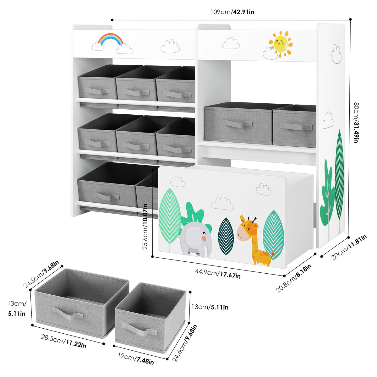 Lesena igrača za shranjevanje knjižne omare z 10 tkaninskimi škatlami in vrati