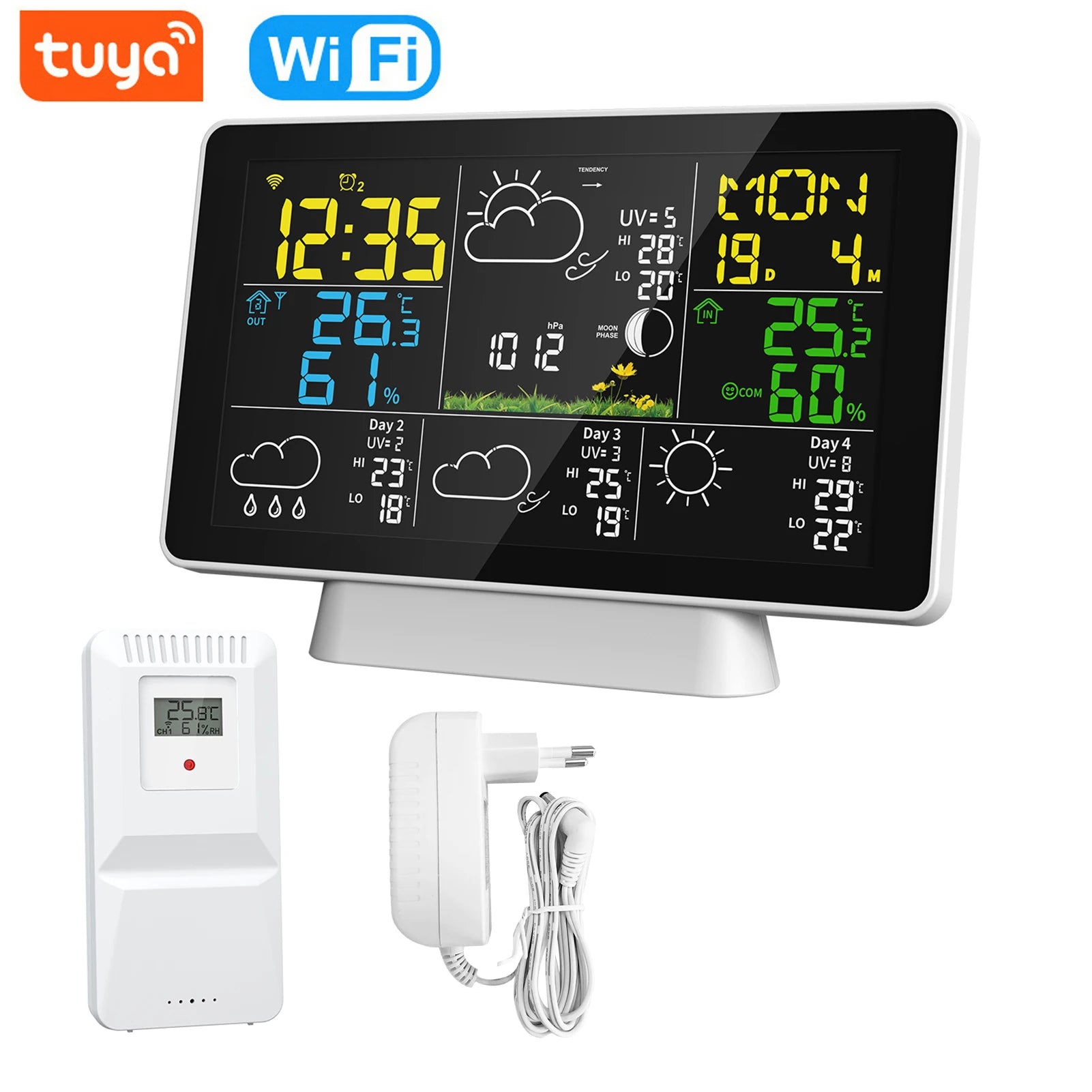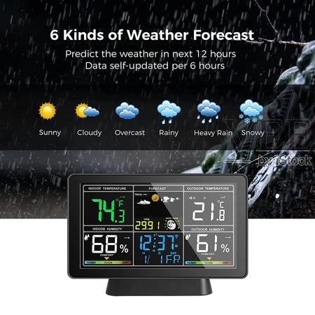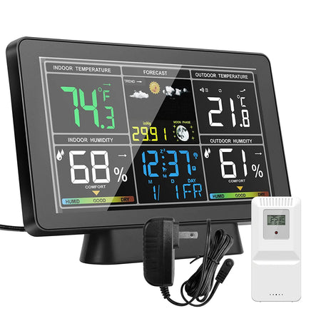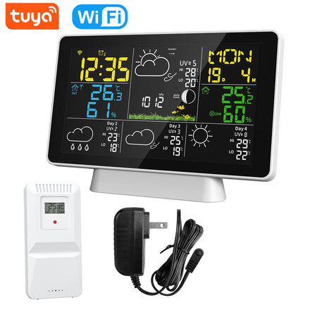 Spoznajte Tuya WiFi vremensko postajo Temp Humidity Moon Phase — vsestranski digitalni higrometer, ki prinaša natančne klimatske vpoglede neposredno na vašo mizo. Z barvnim TN zaslonom prikazuje notranjo in zunanjo temperaturo ter vlažnost, zračni tlak, fazo lune, čas, koledar, indikator udobja in 4-dnevni vremenski trend. Povežite se preko WiFi, da samodejno sinhronizirate lokalni čas in datum, dostopate do natančnih napovedi in spremljate razmere od kjerkoli že ste s pametno aplikacijo. Postaja podpira do 3 alarme s prilagodljivimi tedenskimi nastavitvami, temperaturne enote pa lahko preklapljate med °C in °F. Praktična možnost osvetlitve omogoča vidnost informacij, ko je naprava priključena, medtem ko način delovanja na baterije varčuje z energijo. S podporo za do tri oddaljene senzorje lahko na hitro spremljate razmere v otroški sobi, shrambi, vinskem kleti ali skladišču.
