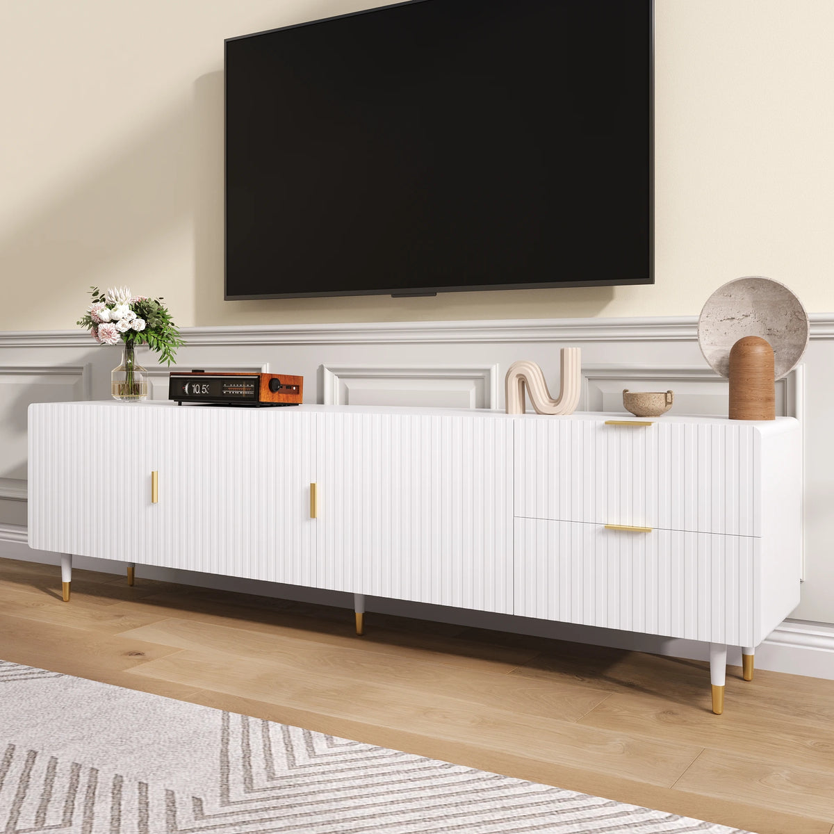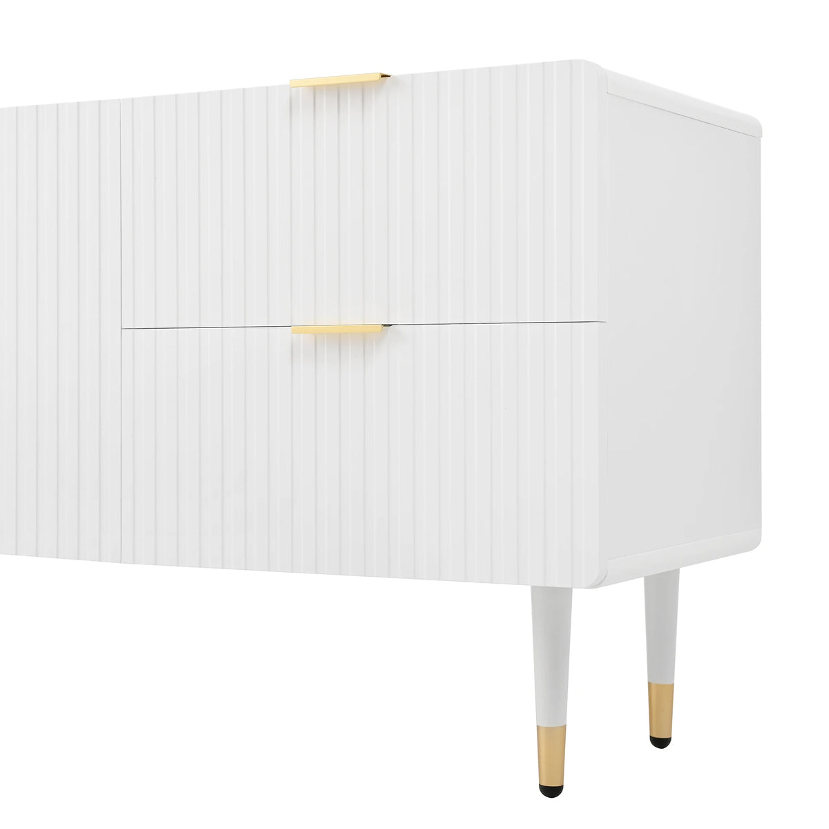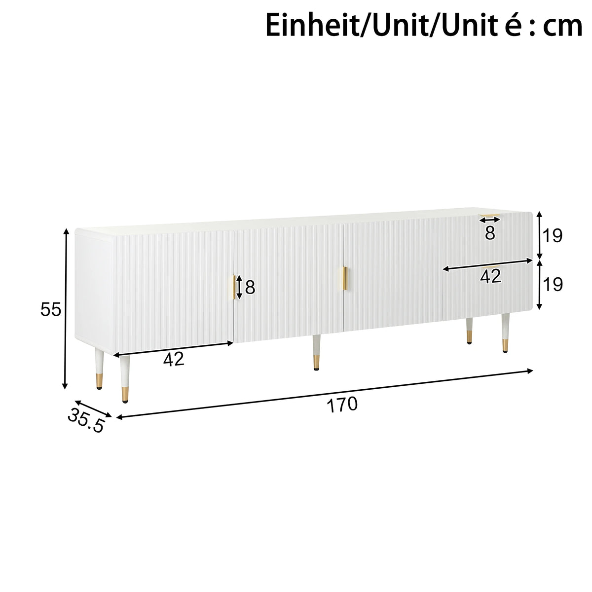 Doživite moderno eleganco s TV omarico s tremi vrati z zlatimi ročaji in nastavljivimi nogami. Ta sodobna TV stojala je zasnovana za shranjevanje vaše televizije in avdio opreme, hkrati pa ohranja kable lepo organizirane s praktičnimi zadnjimi izhodi za kable.