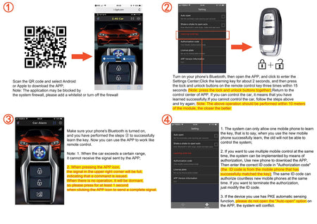 Pomembne opombe: ta sistem je univerzalen za 12V vozila, vendar ne deluje z originalnim sistemom za zagon s pritiskom na gumb, centralnim zaklepom vrat z dvojnim impulznim odklepanjem ali pnevmatskimi zaklepi vrat. Povezati ga je treba na pravilno napajanje znotraj razpona 8-20V. Priporočena je strokovna namestitev, pravilno ožičenje pa je ključno za preprečevanje kratkostičnih povezav ali pregorevanja komponent. Če imate kakršna koli vprašanja po dostavi, se obrnite na našo podporo—jasna komunikacija nam pomaga hitro rešiti težave. Navodila za uporabo so na voljo v več jezikih (angleščina, ruščina, portugalščina, španščina in drugi) preko QR kode, ki je priložena v navodilih.
