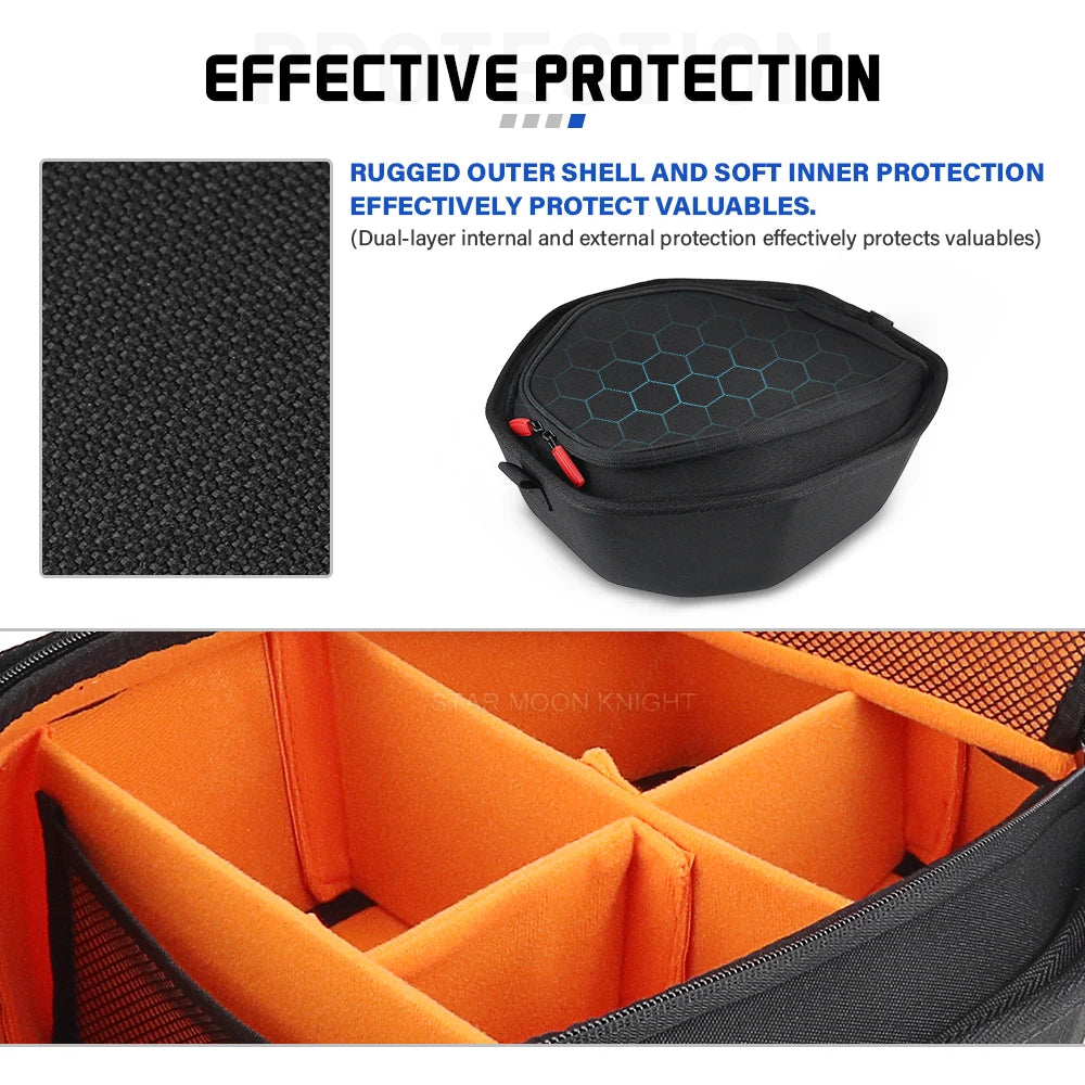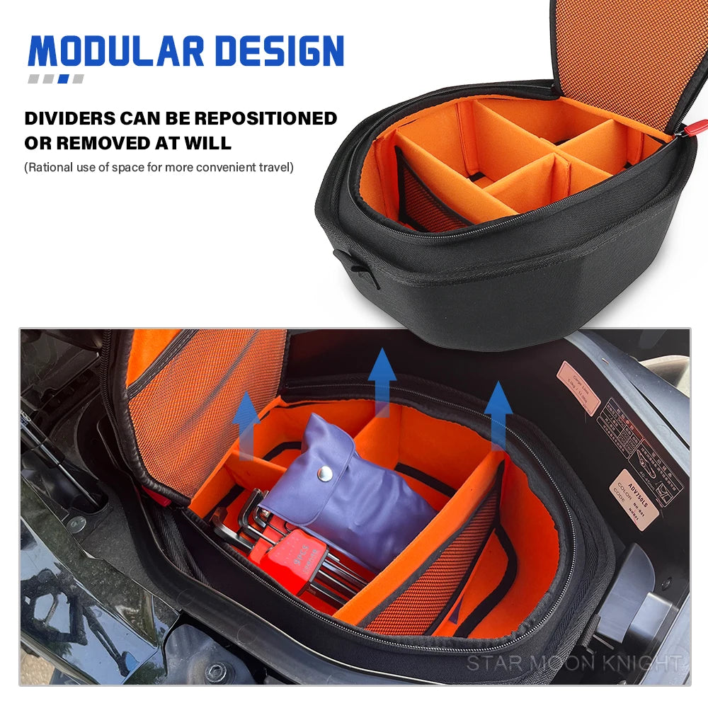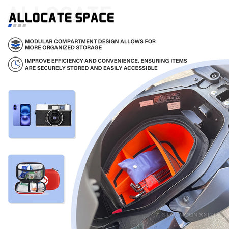 Hrbtna stran podložka ima samolepilni Velcro, ki zagotavlja hitro in varno pritrditev ter udobno prileganje. Zmanjšuje tveganje za poškodbe zaradi neravnih površin in pomaga ohranjati vsebino stabilno in zaščiteno med vožnjo. Ta celoten paket tudi izboljša splošni videz shranjevalnega prostora vašega motocikla z dodajanjem čistega, prilagojenega zaključka.