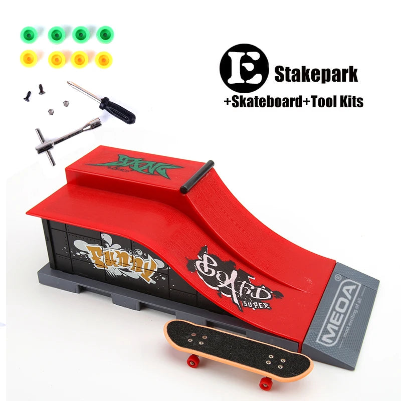 Inkluderar i paketet: 10-delars ramp- och hinderkombinationsset för att bygga en mini skatepark.