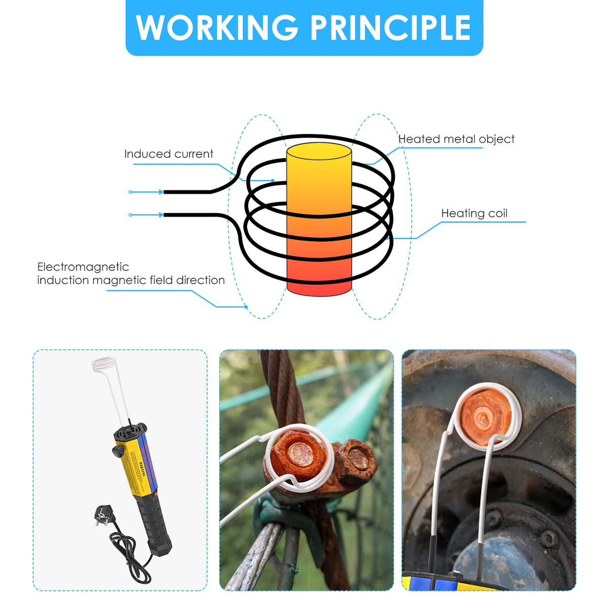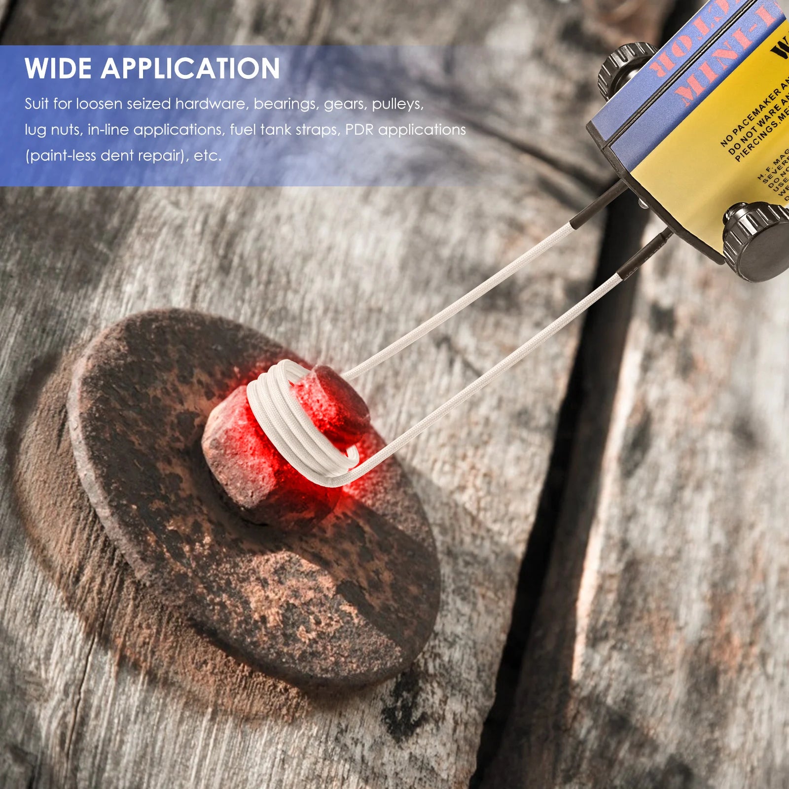 Fördel: Säker uppvärmning utan öppen låga, vilket gör den idealisk för rostiga bultar, muttrar, kugghjul, remskivor, lager, sensorer och andra metalldelar.
