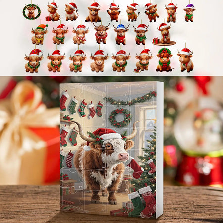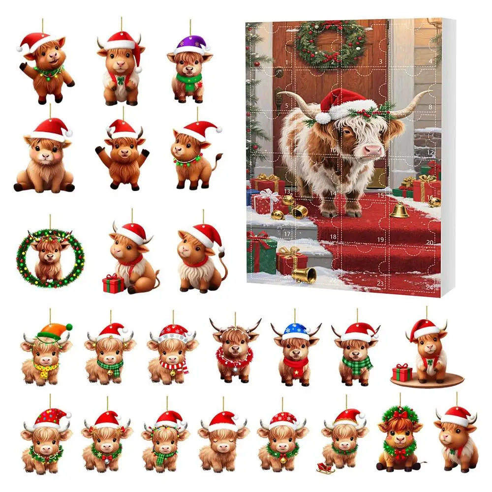 Akryl Highland-ko adventskalender hängsmycke, 24 dagars julnedräkning för hem- eller bildekoration