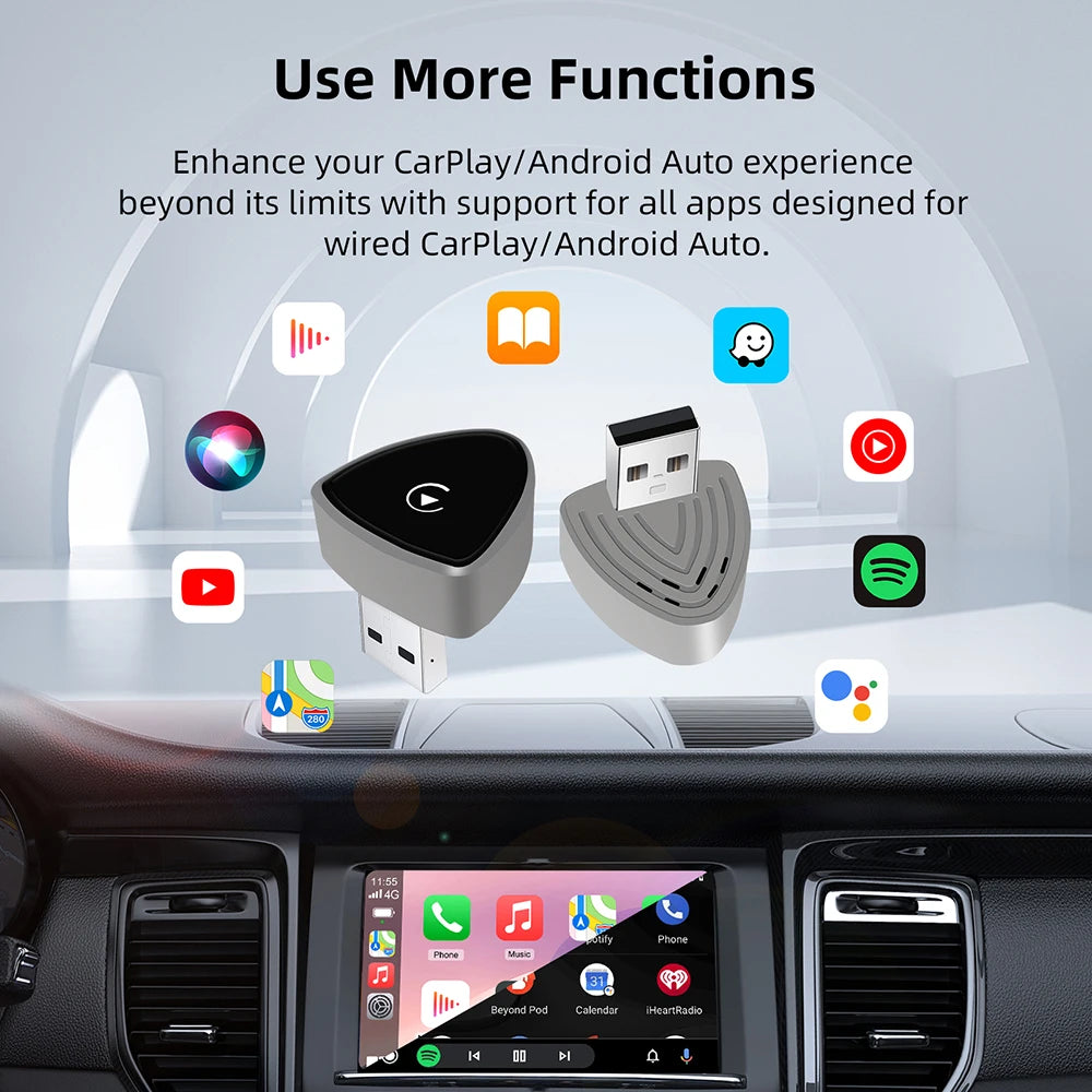 - Trådlös CarPlay och Trådlös Android Auto i en kompakt adapter, vilket minskar kabeltrassel och håller din instrumentbräda prydlig.