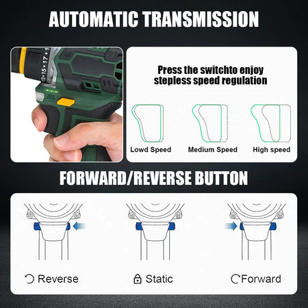 - Två hastighetskontrolllägen och kontinuerlig hastighetsjustering: växla mellan borrning och skruvdragning och anpassa takten efter din uppgift.