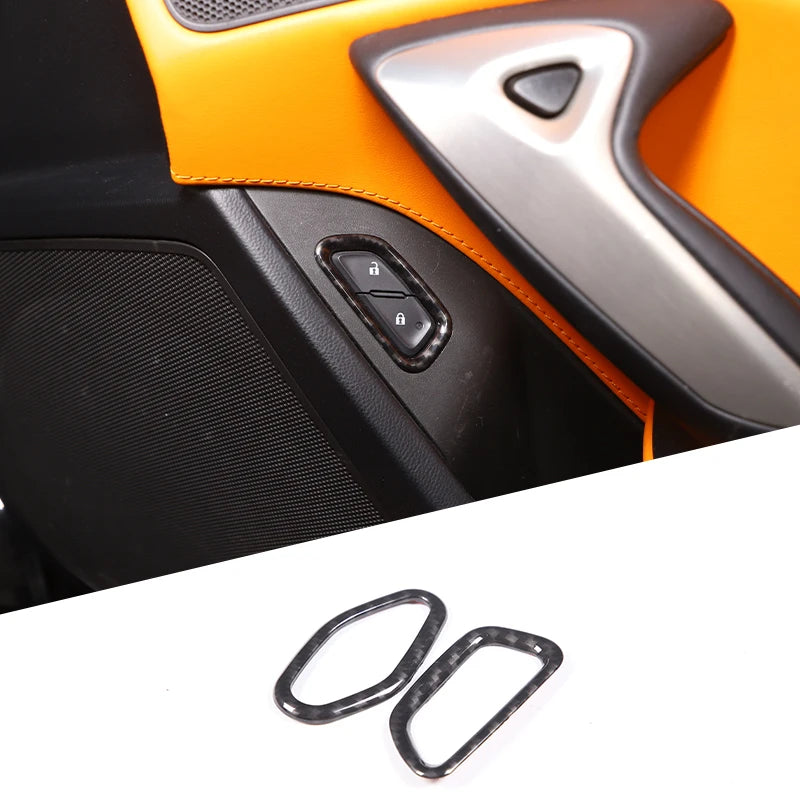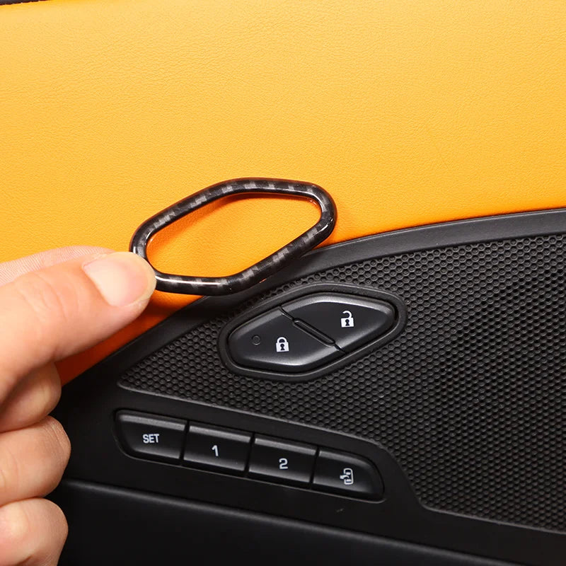 Förbättra och skydda din Chevrolet Corvette C7 Z06-interiör med 2 st ABS-kolfiberinredningsdekaler för dörrlås. Tillverkade av högkvalitativ ABS-plast och med finish i kolfiber, matt svart eller röd, skyddar dessa dekorativa ramar dörrlåsområdet från repor och dagligt slitage samtidigt som de tillför en sofistikerad sportig accent till din cockpit. Tillverkade i en ISO 9001-certifierad fabrik har dessa ramar en hållbar, slitstark yta och enkel installation tack vare dubbelhäftande biltejp på baksidan. Specifikt designade för Corvette C7 Z06-modeller från 2014–2019, passar de säkert över den befintliga listen och kräver inga verktyg eller borrning. Vänligen bekräfta att den avbildade designen matchar din bil före installation för bästa passform.