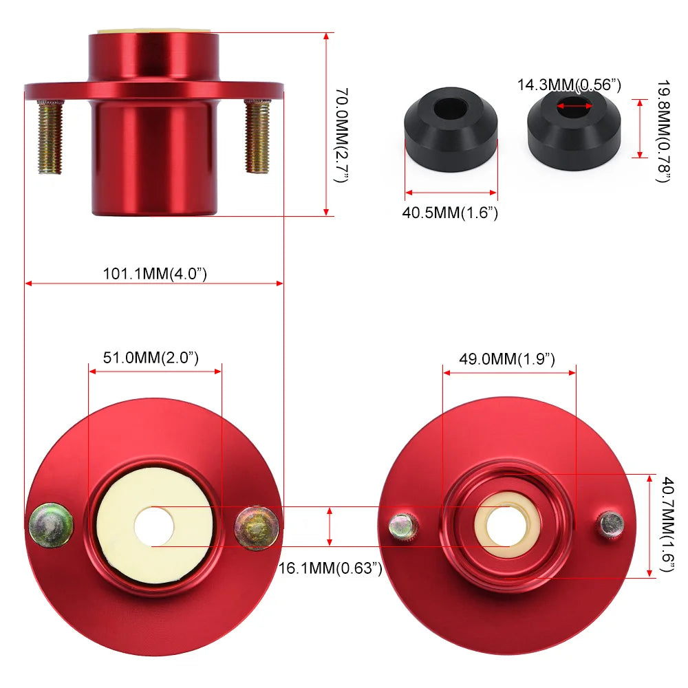 - Kompatibilitetsnotering: Passar fram- eller bakupphängningsstötdämpare; avsedd för användning med coilovers/stötdämpare som accepterar en topp-hatt stil montering