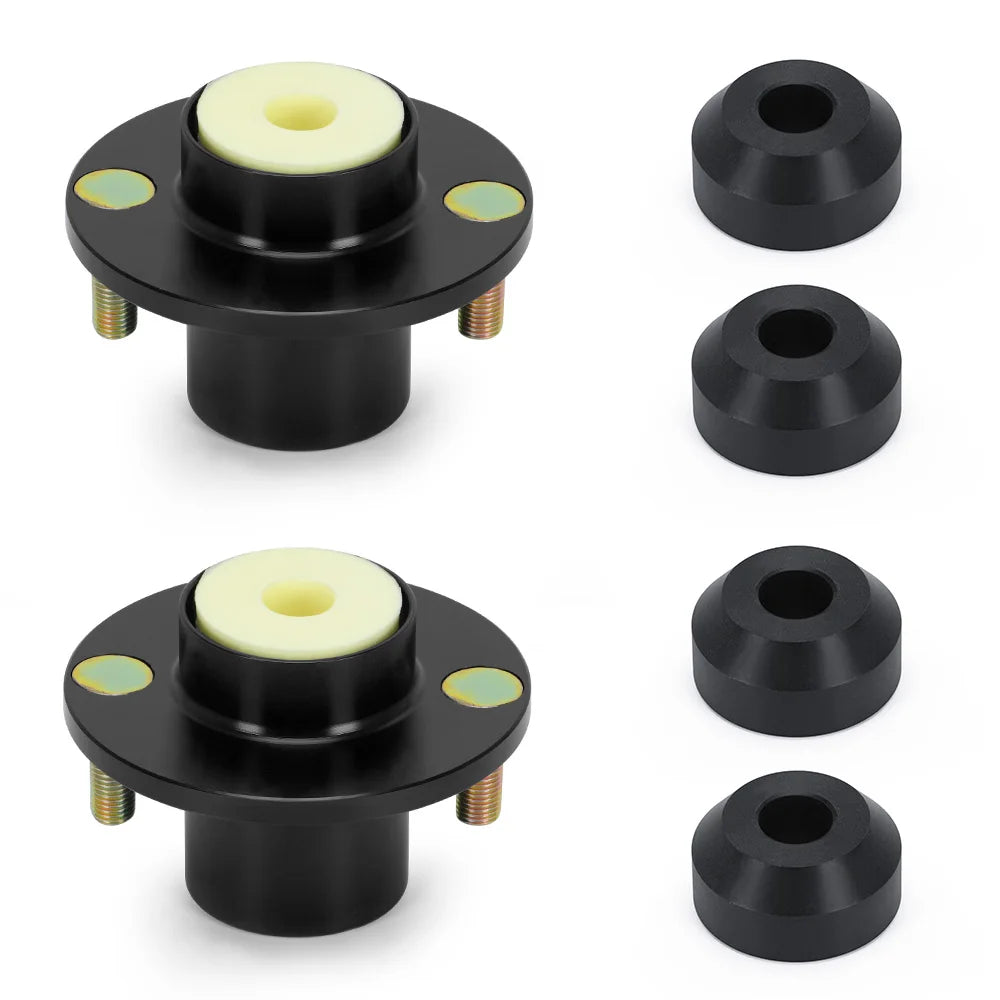 Nyckelfördelar inkluderar ytterligare 24 mm av upphängningens rörelse, som kan uppnås genom att använda dessa toppar med de flesta kända märken av coilovers eller stötdämpare. Den förbättrade rörelsen hjälper till att minska bottenkontakt vid aggressiv körning och förbättrar den övergripande hanteringen, särskilt när de kombineras med prestandafjädrar och justerbara dämpare. Topparna är lämpliga för fram- eller bakupphängningsinställningar, vilket erbjuder mångsidighet för en rad byggmål - från gatleenden till helgbana.