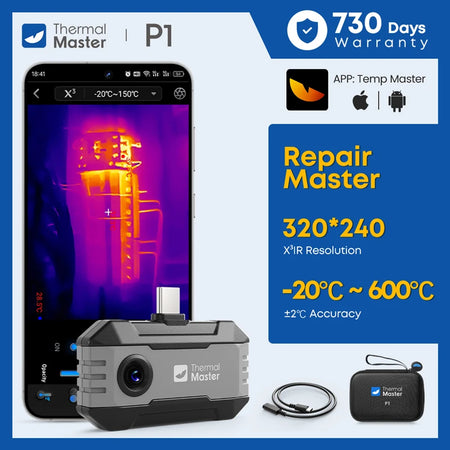 Designad för både professionellt och DIY-användande, kopplas P1 ihop med Temp Master-appen för att leverera realtids temperaturavläsningar, färgpaletter (12 alternativ), smarta larm och enkel datalogging. Den stöder 12 språk, vilket gör den lämplig för team runt om i världen. Enheten är CE, FCC och RoHS-certifierad, vilket säkerställer säkerhet och efterlevnad för EU-kunder. Observera att kameran inte inkluderar ett batteri; din telefon tillhandahåller ström under användning. PC-programvara finns tillgänglig för nedladdning från den officiella Temp Master-webbplatsen, och Android 10-användare kan behöva den speciella appen som tillhandahålls på den officiella webbplatsen.