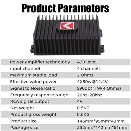 - Utgångseffekt: 80W x 4 @ 14.4V (2Ω, RMS Effekt: 2Ω 4*80W @14.4V)