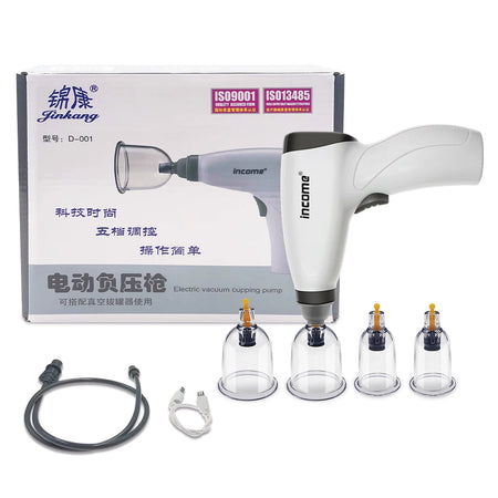 Paketet Innehåller: 4 sugkoppar, elektrisk vakuumpumpenhet, slang och tillbehör som behövs för att påbörja koppningsterapi.