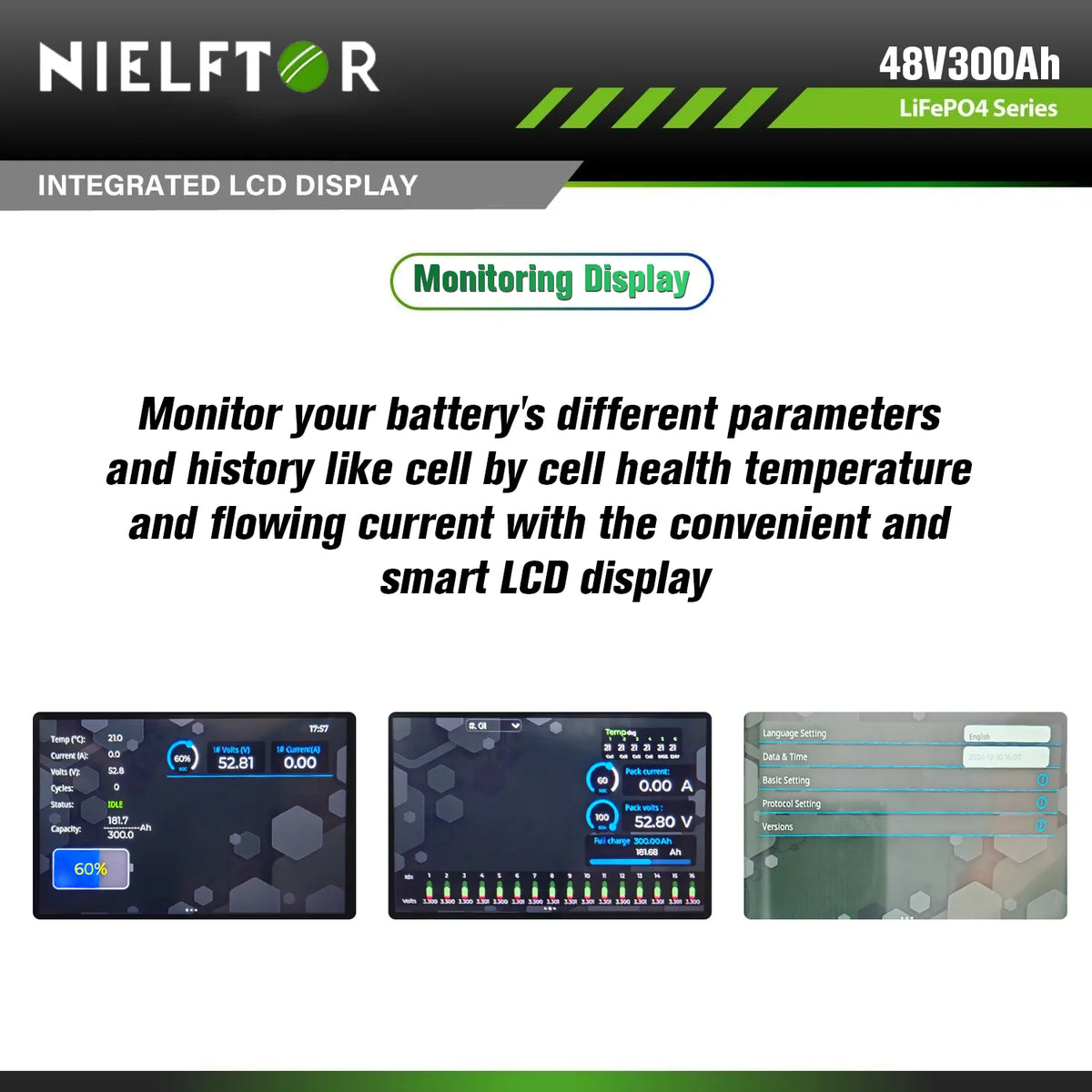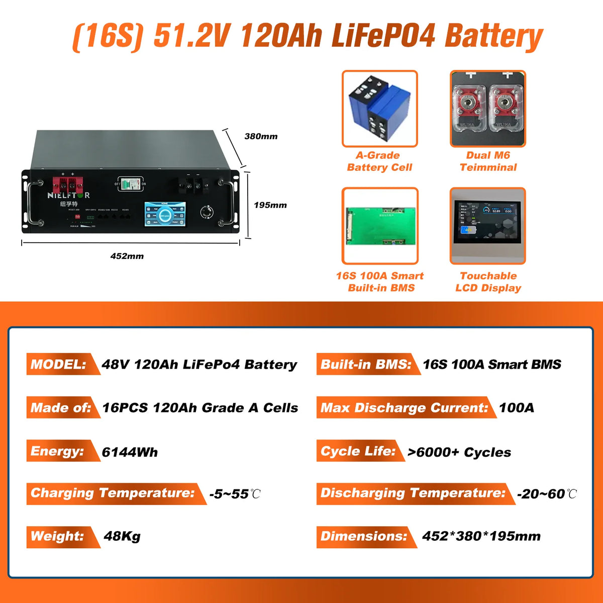 - NIELFTOR 51.2V 300Ah LiFePO4-batteripaket med inbyggd 200A BMS (15,36 kWh)