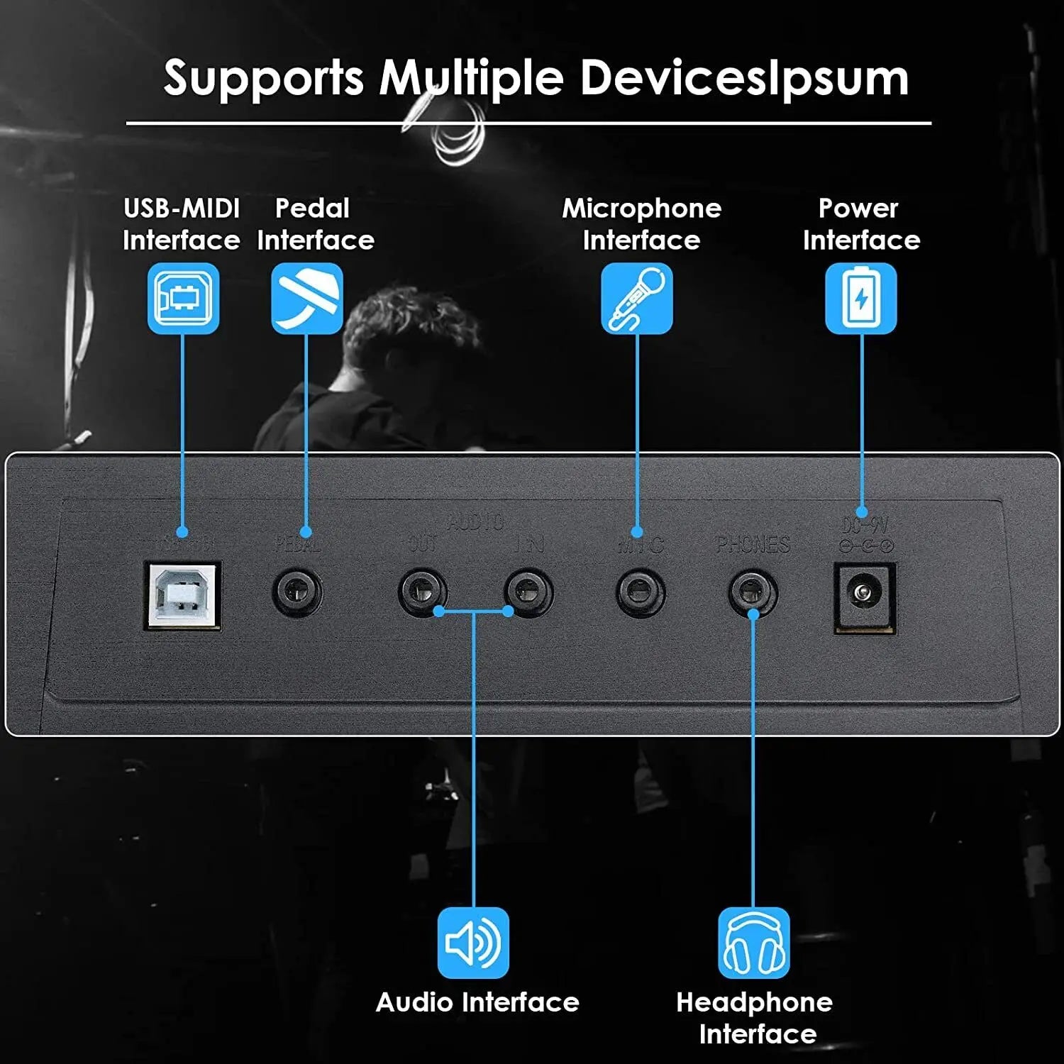 - Stöder MP3-uppspelning, USB MIDI, mikrofoningång och U-diskuppspelning