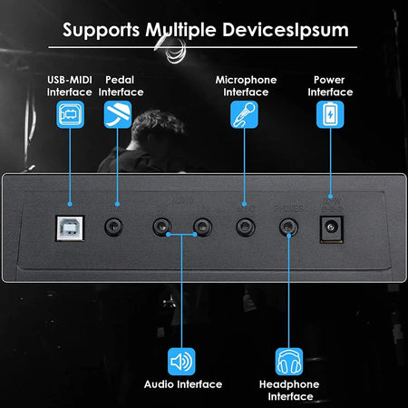 - Anslut till externa högtalare eller en surfplatta via USB MIDI/OTG för förbättrat ljud och interaktiva lektioner.