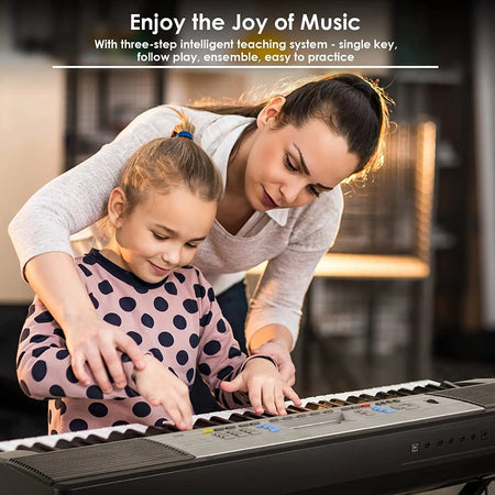 61-tangenters elkeyboard för nybörjare med X-stativ är ett komplett, spelklart pianopaket designat för att väcka glädje och påskynda framsteg för nya spelare. Med 61 semi-viktade tangenter ger detta elektroniska keyboard en responsiv känsla som hjälper nybörjare att bygga rätt fingertäcknik samtidigt som de njuter av en realistisk pianokänsla. Det medföljande X-stativet och pallen skapar en bekväm övningsplats på din föredragna höjd, vilket gör övningspassen roligare från början.