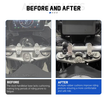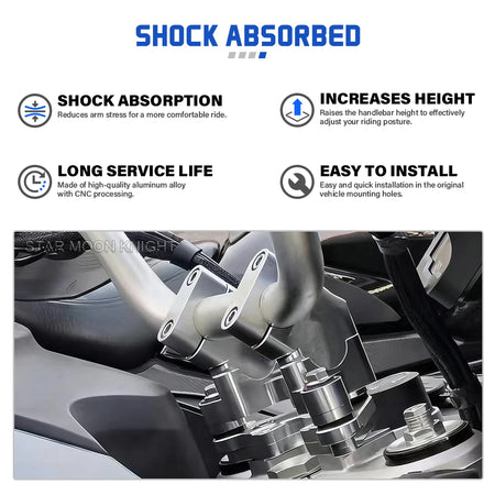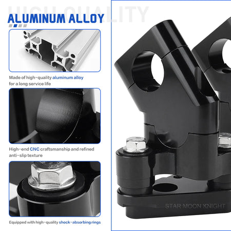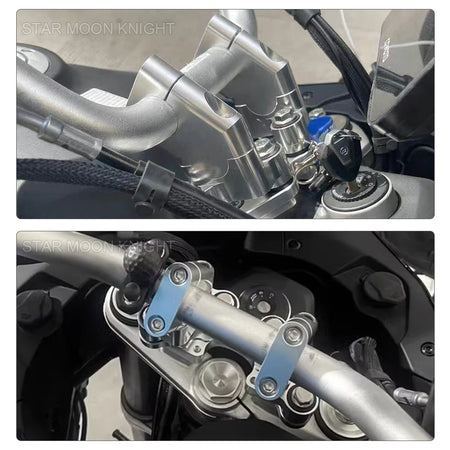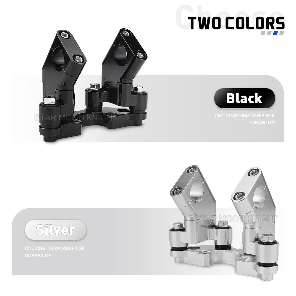 Förbättra din CFMOTO-upplevelse med Star Moon Knight Handlebar Risers Clamp Adapter. CNC-bearbetad i högstyrkealuminiumlegering och med en anodiserad yta är dessa risers precisionsgjorda för att passa perfekt med CFMOTO 450MT, 800MT och 800MT-X modellerna. Designade för att integreras med ett styrdämpningskit, ger de förbättrad styrstabilitet, förfinad hantering och en bekvämare körställning utan att lägga till onödig vikt. Installationen är enkel och, som nämnts i produktfunktionerna, kräver ingen omfattande uppsättning eller komplicerade instruktioner. Finns i silver och svart för att matcha din motorcykels stil. Ursprungligen från fastlands-Kina, är detta tillbehör byggt för att klara krävande turer och tuffa förhållanden.