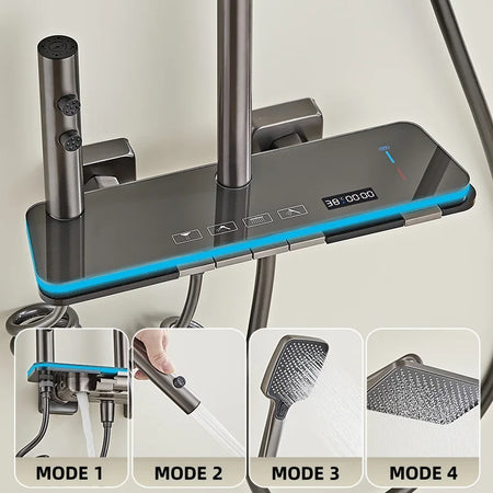 Duschset för badrum med digital display, duschsystem, pianoknapp med atmosfärsbelysning, kran, badkar, blandare, duschhuvud