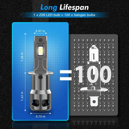 - Bas/Passform: H3, H1, H7 (mini storlek), H11, 9005, 9006, HB3, HB4