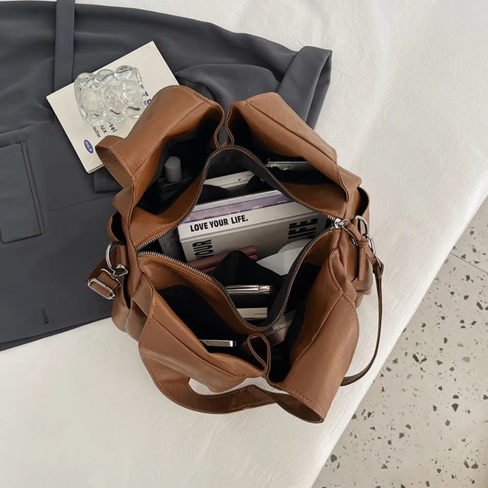 Möt PU-läder axelväska för kvinnor, en stor kapacitets hobo shopper tote designad för vardagslivet. Tillverkad av mjukt PU-läder med ett hållbart polyesterfoder, denna enfärgade pendlarväska kombinerar mode med funktion. Dess rymliga huvudfack håller dagliga nödvändigheter—plånbok, nycklar, telefon och mer—prydligt organiserade, medan de inre fickorna ger snabb åtkomst till en telefon eller små föremål. Med en säker dragkedja och hasp stängning kan du bära med självförtroende genom arbete, resor eller helgäventyr. Den avslappnade tote-silhuetten och modeinriktade finishen gör den tillräckligt mångsidig för kontorsutseenden, shoppingturer och allt däremellan. Ursprungligen från Hebei-provinsen, Fastlands-Kina, är denna väska byggd för hållbarhet och stil, redo att följa dig vart du än går.