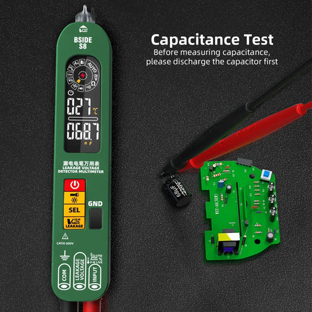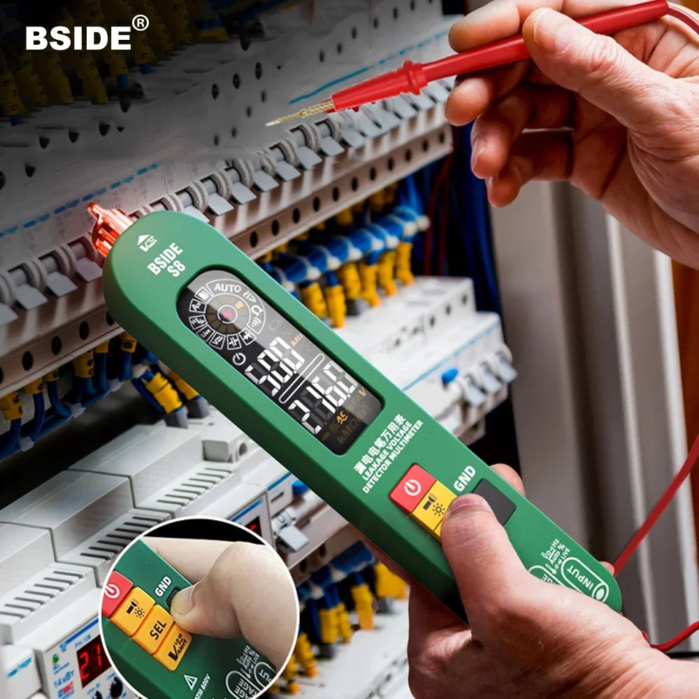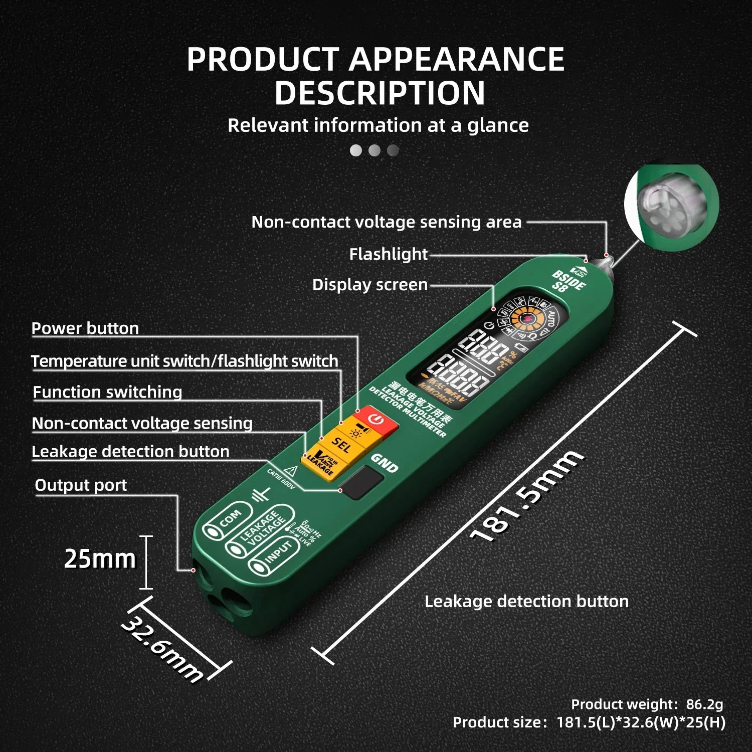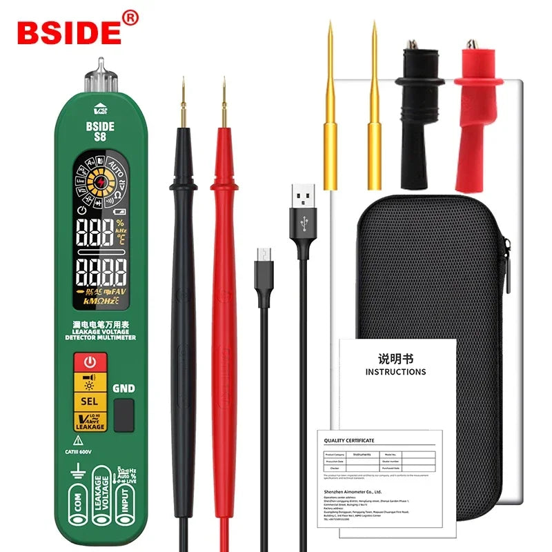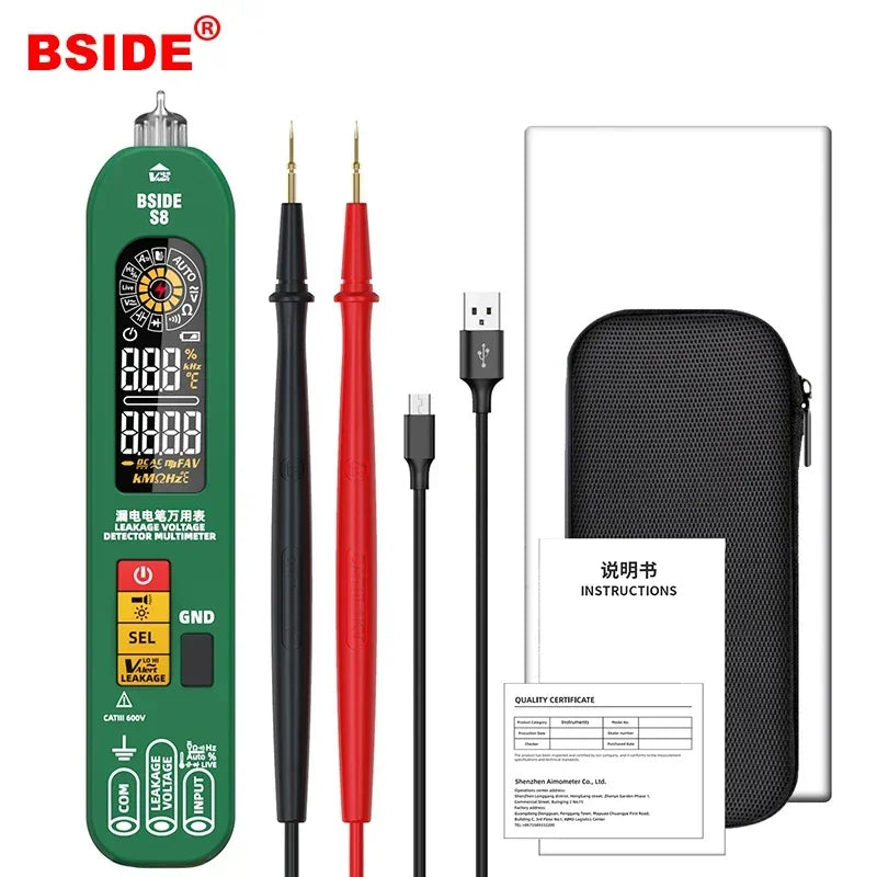 Möt BSIDE S8 Läcksäkerhetstestare, en kompakt digital multimeter designad för noggranna elektriska tester med praktiska säkerhetsfunktioner. Den mäter AC- och DC-spänning upp till 620V, utför automatisk mätning för snabb och problemfri användning och inkluderar icke-kontakt spänningsdetektering (NCV) för att hjälpa dig att lokalisera strömförande kretsar utan direkt kontakt. Med verkliga RMS-avläsningar, en digital skärm och en inbyggd ficklampa är detta verktyg idealiskt för gör-det-själv-entusiaster och yrkesverksamma som arbetar i trånga eller svagt upplysta utrymmen. Uppladdningsbar och lätt att bära, kombinerar S8 tillförlitlighet med användarvänlig ergonomi för att förenkla vardagliga elektriska kontroller, läckagetester, felsökning av ledningar och underhåll av elektronik.