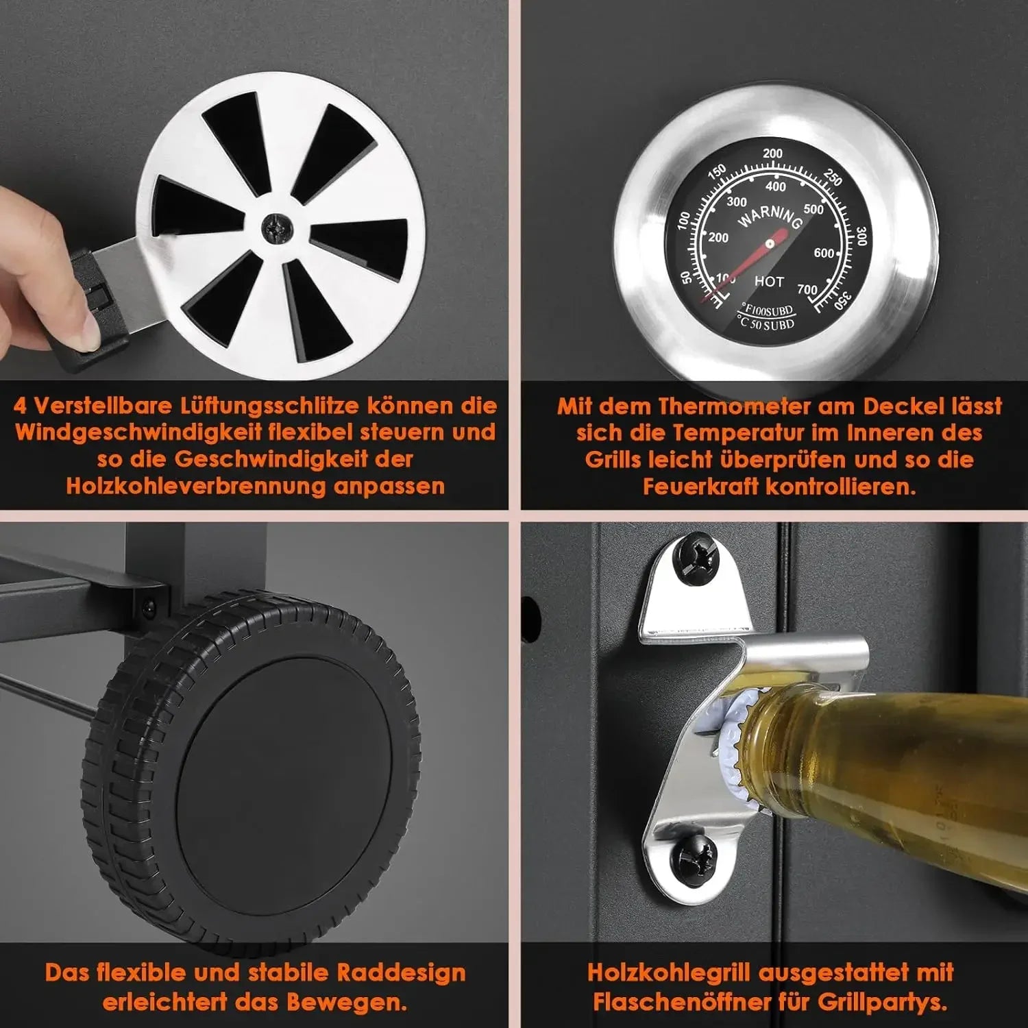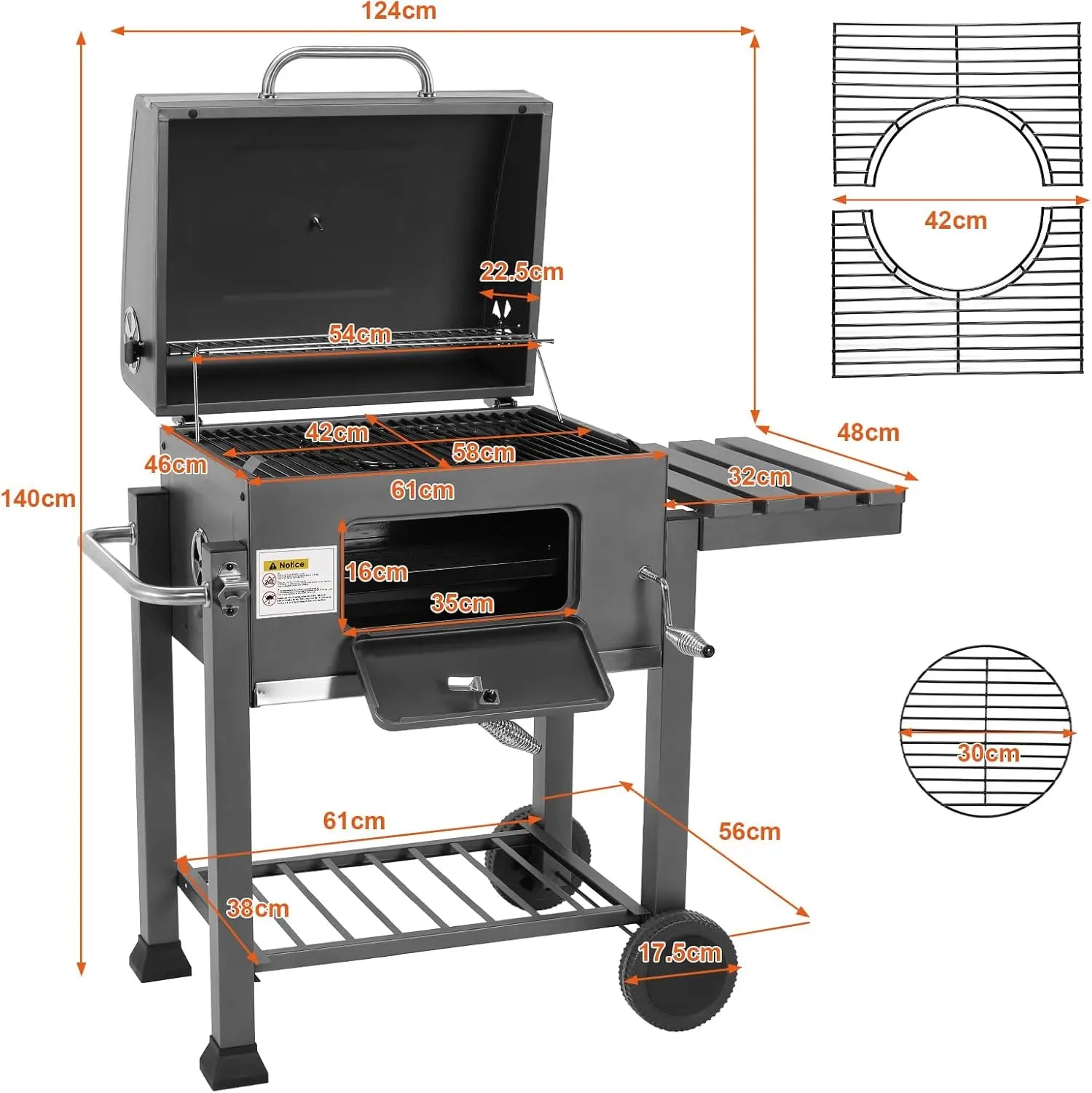 Upptäck Charcoal BBQ Smoker Grill XXL, en mångsidig grillvagn designad för seriös utomhusmatlagning. Med en robust stålkonstruktion och en pulverlackerad yta kombinerar denna BBQ-uppsättning hållbarhet med praktiska funktioner som ett handtag, en vikbar arbetsyta och gott om förvaringsutrymme. Det dubbla grillsystemet ger rika rökiga smaker samtidigt som du får exakt värmekontroll, så att du kan bryna, rosta och röka med självförtroende. Två hjul gör det enkelt att flytta runt på uteplatsen, balkongen eller i trädgården, medan den främre kolåtkomstluckan och utdragbara asklådan förenklar påfyllning och rengöring mellan tillagningarna. Denna XXL-modell är byggd för att hantera helgsammankomster och stora familjemåltider med lätthet.