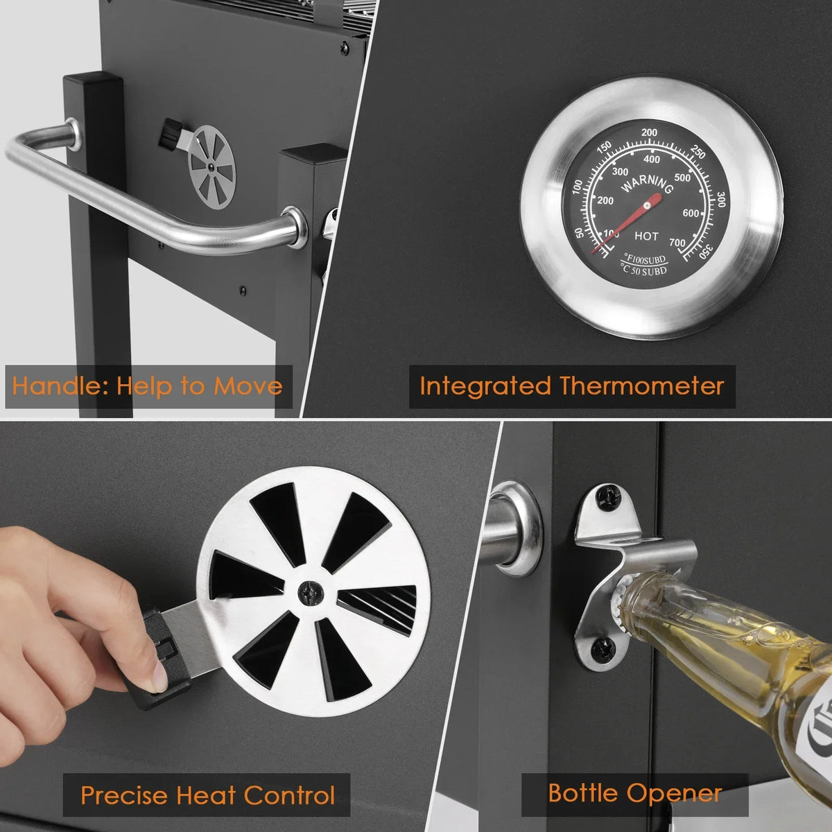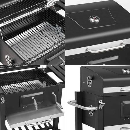 Möt din favoritkolgrill för trädgårdsträffar, campingresor och utomhusmatlagning: Charcoal Grill With Foldable Side Table Heavy Duty Outdoor. Byggd för hållbarhet och mångsidighet kombinerar denna offset smoker-stil grill en rymlig tillagningsyta med praktisk förvaring, hopfällbart sidobord för förberedelser och enkla rengöringsfunktioner för att lösa vanliga grillutmaningar. Justerbara ventiler, ett locktermometer och ett höjdjusterbart kolgaller ger dig exakt värmekontroll, så att du kan steka, baka och röka med självförtroende.
