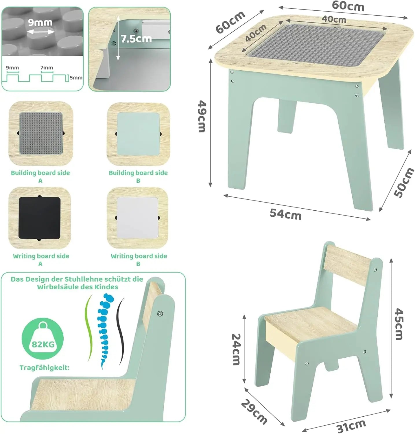 - Särskilda funktioner: avtagbara dubbelsidiga bordsskivor; avtagbar byggklossbräda med konkava/konvexa texturer