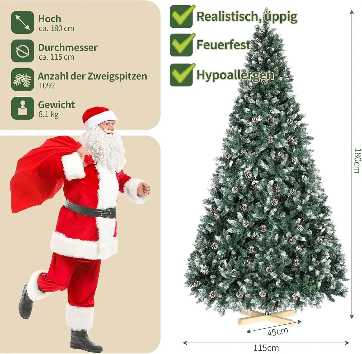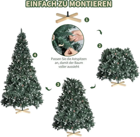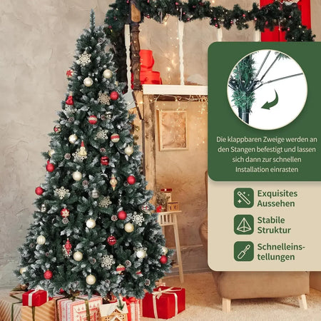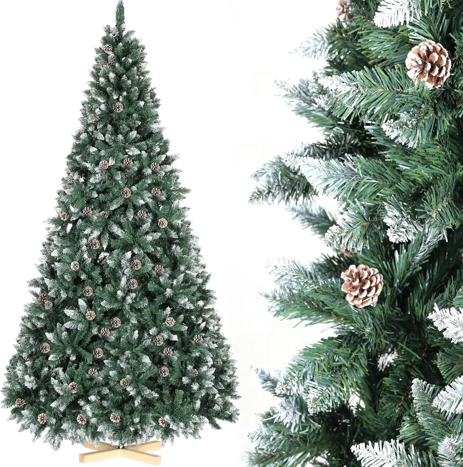 Förvandla ditt julutrymme med Julgran med kottar och snö, tillgänglig i fem höjder från 150 till 270 cm (5 till 9 fot). Denna Nordmannsgran premium konstgjorda gran är designad för att se otroligt verklighetstrogen ut, med hundratals tätt packade grenändar, realistisk färgsättning och förtrollande snö plus riktiga kottar för en omedelbar vinterkänsla. Tillverkad av hållbar PVC och PE, är den lätt att underhålla, hypoallergen och brandsäker för säkrare dekoration med familj och vänner. En handgjord träbas tillför naturlig elegans och stabilitet, medan förmonterade gångjärnsgrenar gör uppsättningen snabb och enkel. Med justerbara toppar och grenar kan du fluffa och forma granen för att uppnå ett fylligt, lyxigt utseende på några minuter.