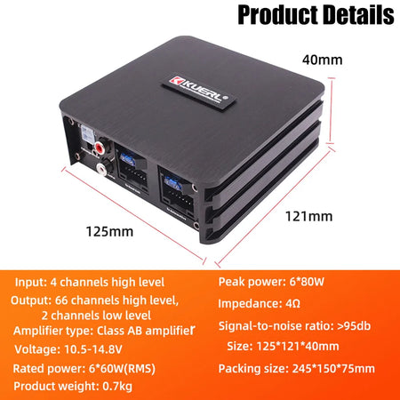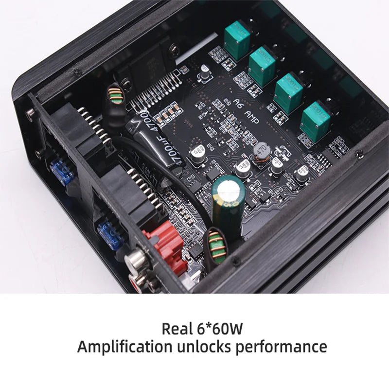 Upplev energisk, precisionsjusterad bil ljud med ZUIDID Bil DSP Förstärkare (modell K-DSP6). Denna sexkanals förstärkare levererar 6 x 60W RMS vid 4 ohm, innesluten i ett robust chassi av aluminiumlegering för hållbarhet och enkel installation. Byggd för bilmiljöer, kombinerar den kraftfull prestanda med DSP-funktioner för att optimera din högtalaruppsättning, minska distorsion och leverera klart, välbalanserat ljud över hela frekvensområdet.