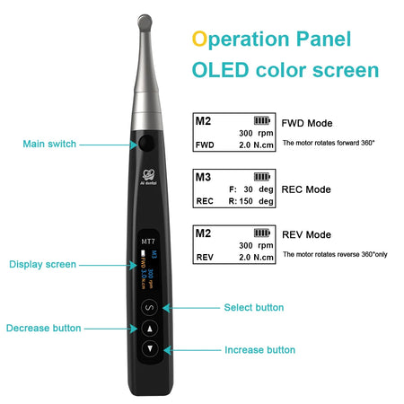 Möt AI Endo MT7 16:1 Endomotor Handstycke med 360-graders rotation, konstruerad för precis och effektiv endodontisk instrumentering. Tillverkad i hållbart metall och designad med en internationell E-typ kontakt, integrerar den ett starkt LED-ljus via en fiberoptisk stav för klar, skuggfri sikt. OLED-färgskärmen visar viktig data med en blick, medan hastighetsintervallet 120–700 rpm och vridmomentet 0,6–4,0 N·cm ger kontrollerad prestanda över olika kanalantonomier. Den 16:1 växlingen levererar starkt vridmoment vid lägre hastigheter för säker förberedelse, och med endast 150 g förblir den bekväm att hantera under längre procedurer. Med vinklar för reciprok rörelse på 30–150/150–30/90–90 anpassar sig detta handstycke till flera tekniker, vilket gör det till ett mångsidigt tillskott i moderna tandvårdskliniker. Ursprungligen från Fastlandskina och CE-certifierad, är AI Endo MT7 byggd för pålitlighet och långvarig användning, drivs av ett 3,7V, 1900mAh ICR18500-batteri för stabil drift.