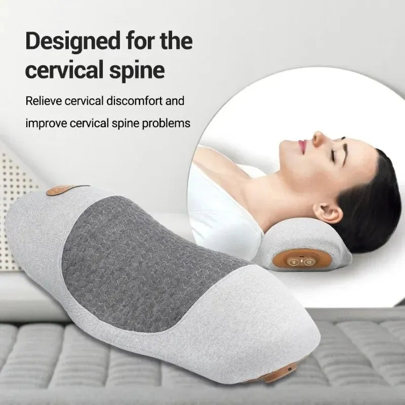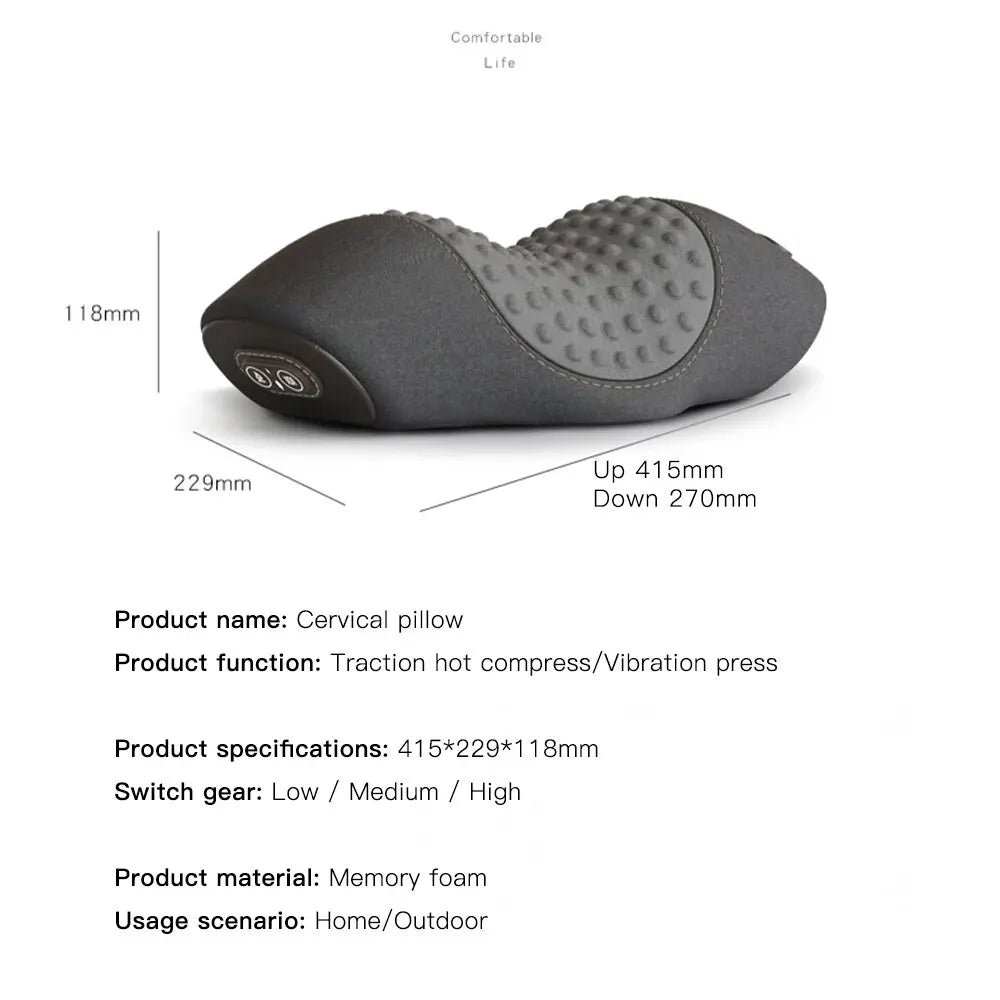 - Egenskaper: Ergonomiskt utformad för att passa kurvorna på huvud, axlar och nacke; ger starkt huvudstöd; slappnar av halsryggraden; lindrar obehag i axlar och nacke; förbättrar sömnkvaliteten; tre nivåer av konstant temperatur varm kompress + tre nivåer av vibrationsmassage; luftbomull med minnesfunktion återhämtar sig långsamt för att ge säkert, tryckfritt stöd