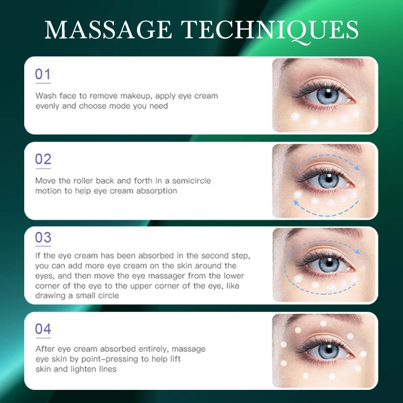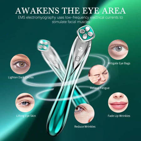 Upplev ett genombrott inom ögonvård med Eye Massage Device Microcurrent Skin Firming Anti Aging. Detta multi-effekt instrument kombinerar EMS mikroström, röd ljusförnyelse, ljudvågsvibration och en 42°C varm kompress för att lyfta, jämna ut och fräscha upp den känsliga ögonkonturen. Använd med din favorit ögonkräm eller serum för att öka absorptionen och rikta in dig på svullnad, mörka ringar och fina linjer runt ögonen.