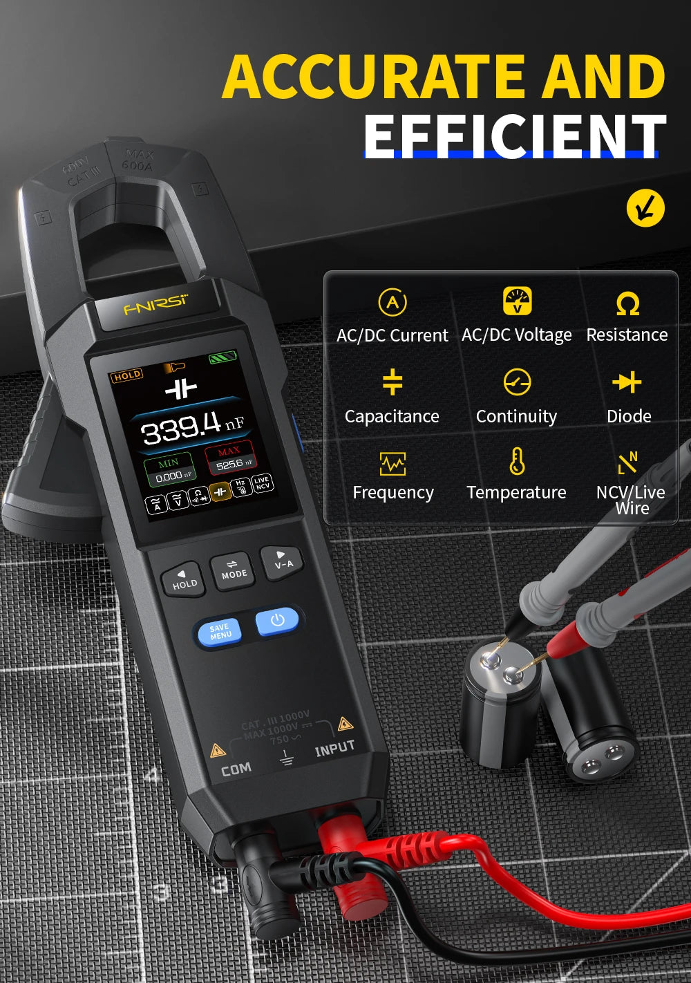 - Använd för snabba, exakta DC/AC spännings- och strömkontroller på elektriska paneler, fordonskretsar och laboratorieexperiment.