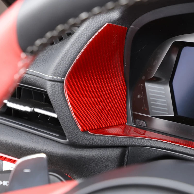 Uppgradera interiören i din 2019-2022 Toyota GR Supra A90 med vårt mjuka kolfiber-instrumentbrädesöverdrag. Tillverkat av mjuk kolfiber i en snygg kolfiber- eller röd kolfiberfinish, ger detta dekorativa överdrag ett exklusivt utseende samtidigt som det skyddar din instrumentbräda från repor, UV-bländning och dagligt slitage. Den precisa passformen följer instrumentbrädans konturer och ger ett sömlöst utseende utan bulk. Enkel installation möjliggörs av en baksida med dubbelhäftande biltejp, vilket gör uppgraderingen snabb och utan kladd. Tillverkat i en ISO 9001-certifierad fabrik, kombinerar denna accessoar stil, hållbarhet och värde för din Supras cockpit. Vänligen bekräfta färg- och modellkompatibilitet innan installation för att säkerställa perfekt matchning.