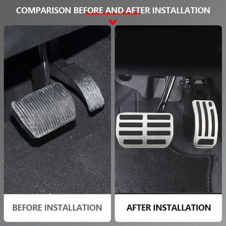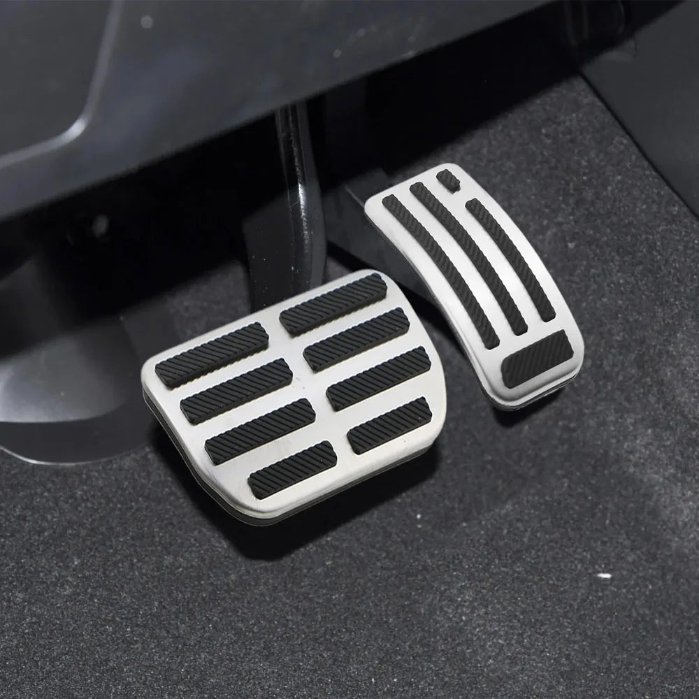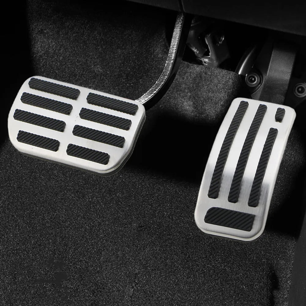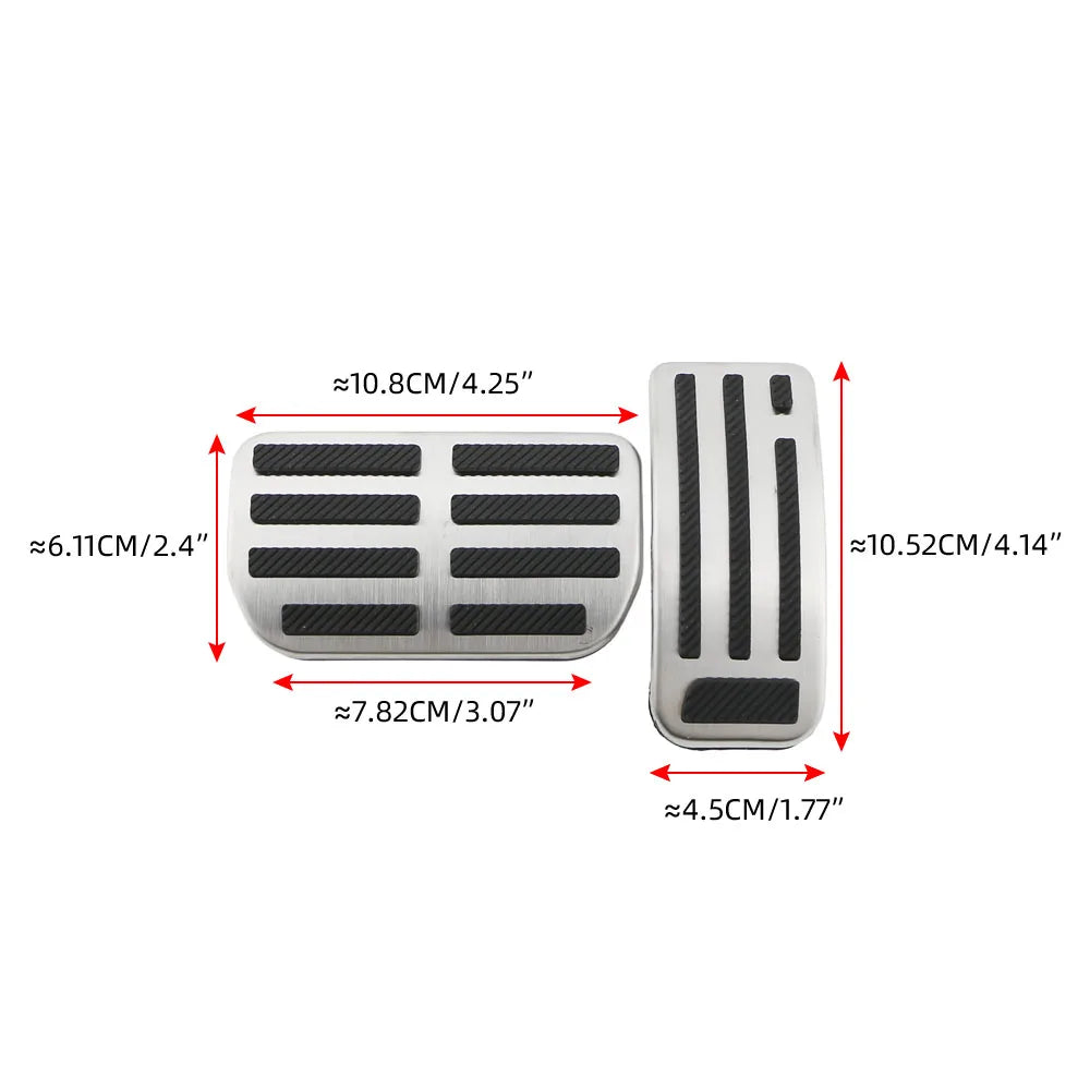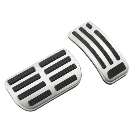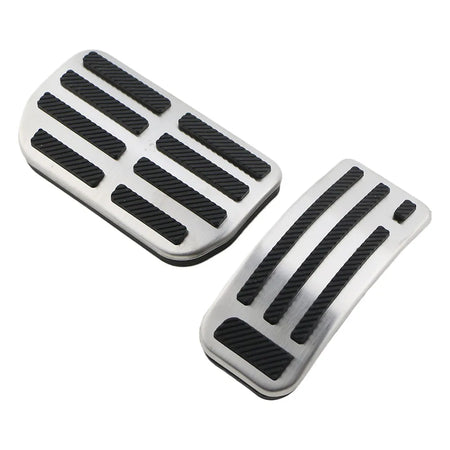 Tillverkade av hållbart rostfritt stål och färdigställda för att matcha utseendet som visas på produktbilderna, motstår dessa pedalöverdrag slitage och ger en säker, halkfri yta även när dina skor är blöta. Gaspedalöverdraget träs enkelt över den befintliga pedalen, medan bromspedalöverdraget kräver att gummit tas bort från den ursprungliga bromspedalen innan installation.