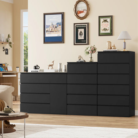 Tillverkad av träpaneler med en vattentålig faneryta, tål den daglig användning och motstår spill. Släta metallskenor gör lådorna enkla att öppna, medan räfflade handtag ger ett bekvämt grepp. Denna mångsidiga byrå passar vackert ihop med andra Getone-byråer från samma kollektion i svart eller vitt, vilket låter dig skapa ett enhetligt förvaringssystem som passar ditt rum.
