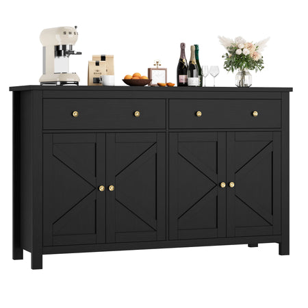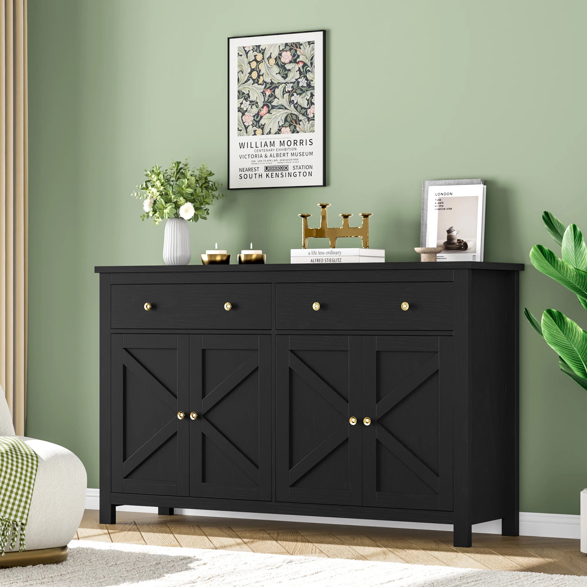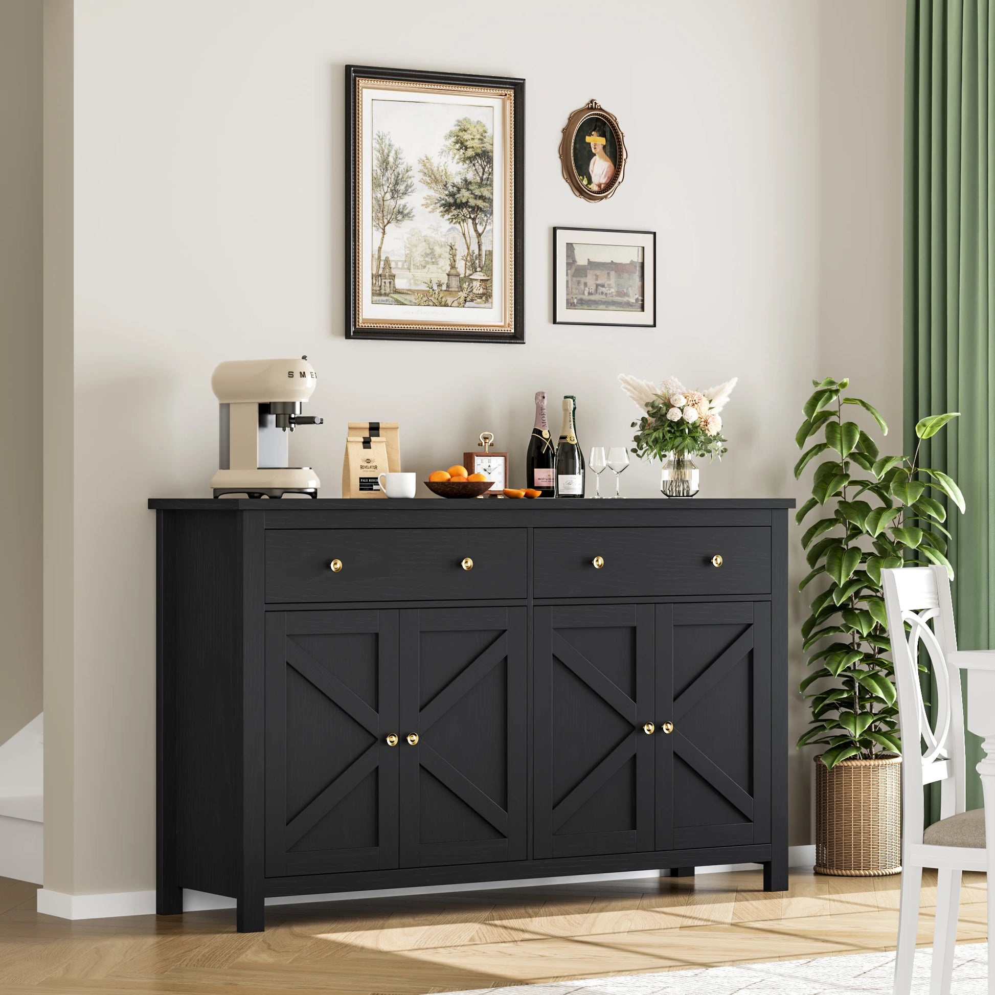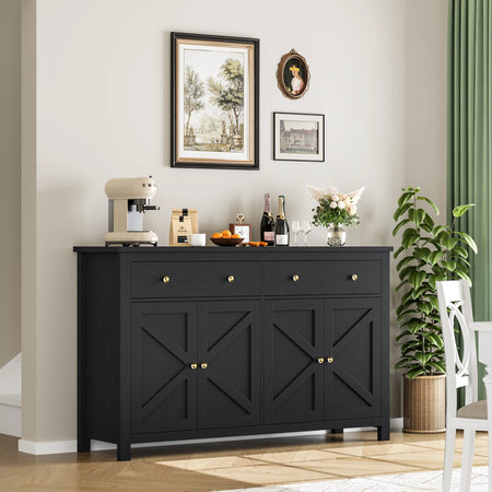 Rymligt förvaringsutrymme är genomtänkt arrangerat: Bordsskivan på 140x40 cm ger plats för kaffemaskin eller brödrost. De två stora lådorna håller bestick, koppar, servetter och andra småsaker prydligt organiserade. Inuti dörrarna finns fyra fack som ger flexibel förvaring för redskap, lock eller porslin i olika storlekar.