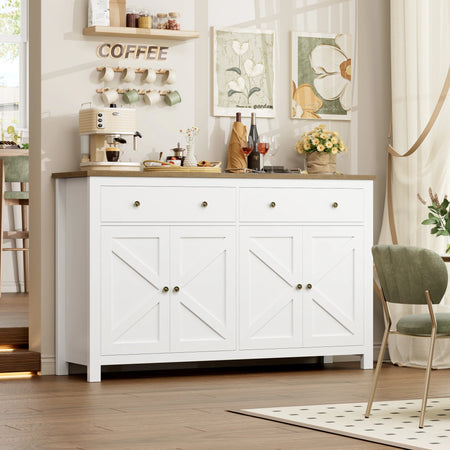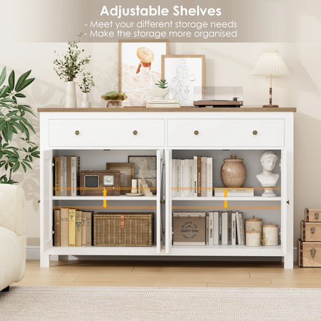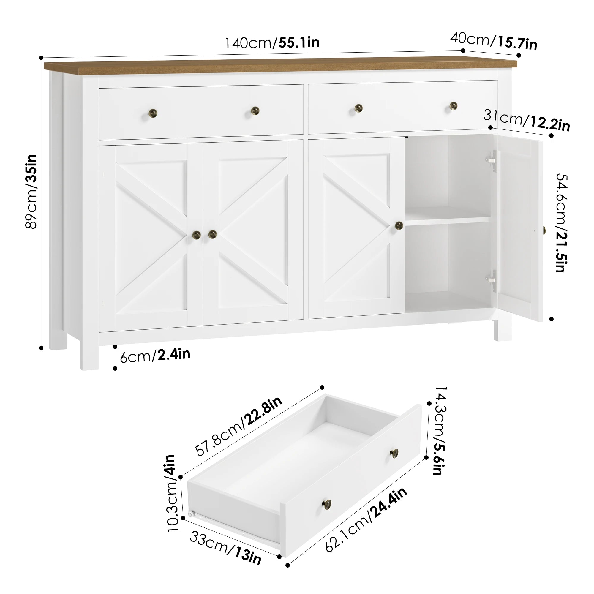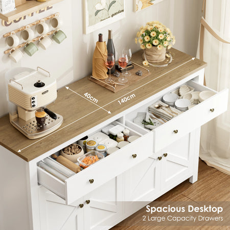 Möt Getone White Sideboard Cabinet 140cm, en mångsidig förvaringslösning designad för moderna hem. Med en ren vit kropp och en bordsskiva i ek kombinerar detta sideboard europeisk inspirerad stil med samtida minimalism för att passa matsalar, vardagsrum, kök eller entréer. Med måtten 140x40x89 cm erbjuder det en rymlig yta för små apparater och organiserad förvaring för dagliga nödvändigheter.
